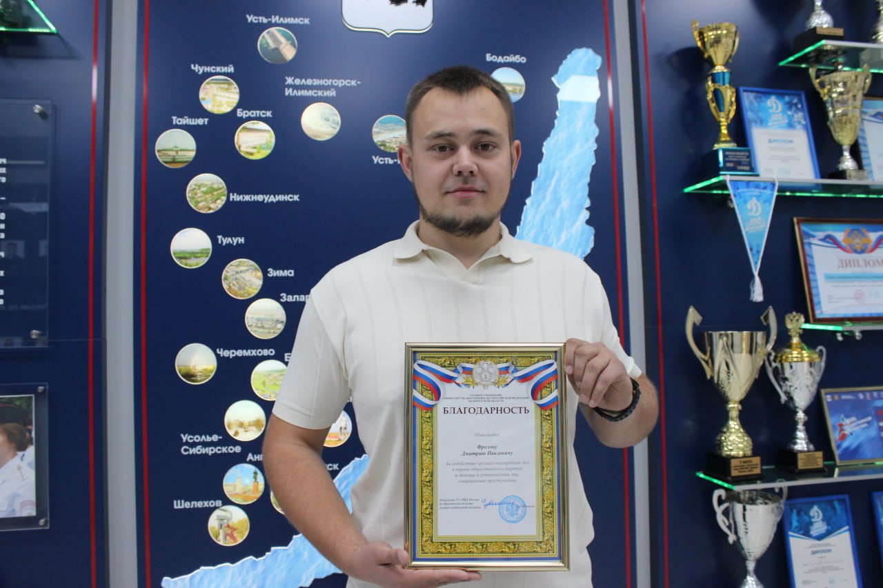 За активную гражданскую позицию и оказание содействия полиции в торжественной обстановке временно исполняющий обязанности начальника Главного управления МВД России по Иркутской области Сергей Тринцуков вручил благодарность жителю областного центра Дмитрию Фролову.