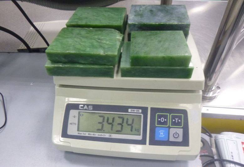 В багаже пассажира инспекторы выявили 8 зеленых камней прямоугольной формы.