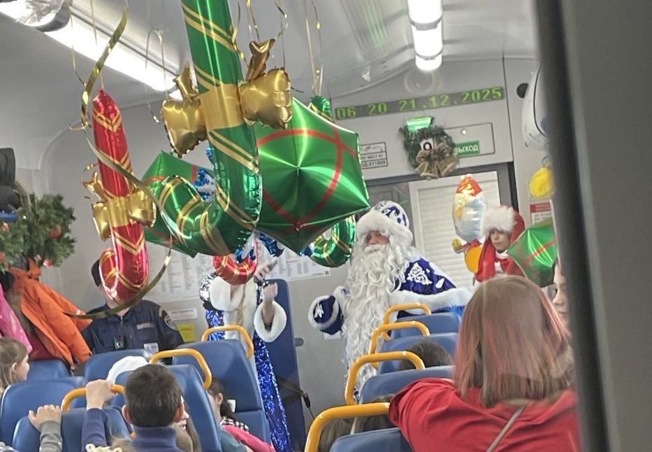 Для маленьких пассажиров в украшенных к празднику вагонах организовали яркое представление. Главными атрибутами предпраздничного путешествия стали подарки и фотосессия с героями праздника.