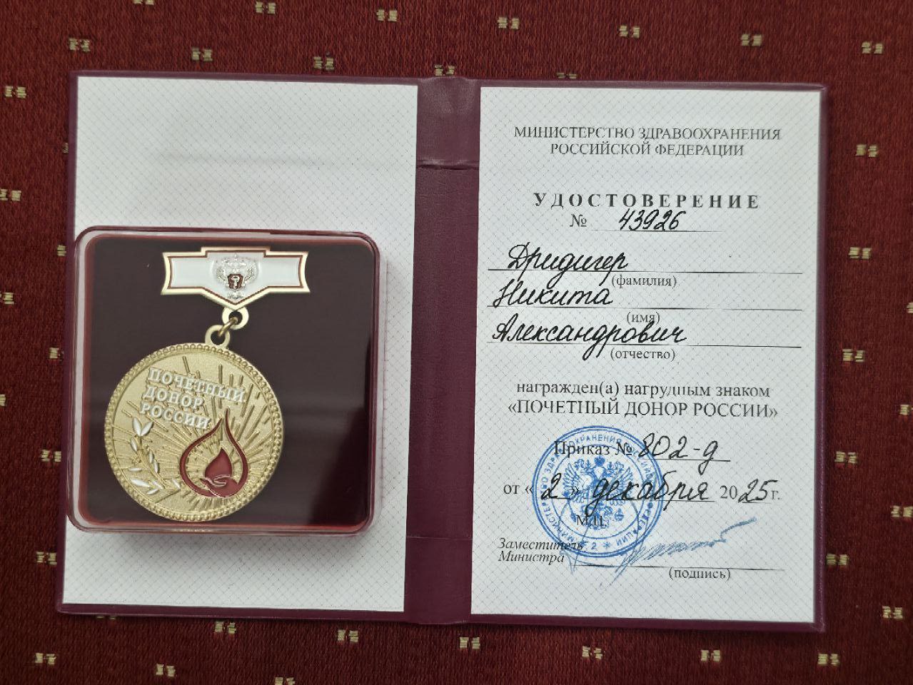 В свои 25 лет Никита сделал 50 донаций: 26 донаций крови (4 из который сдавал в г. Москва во время служебных командировок), 22 донации плазмы и 2 донации тромбоцитов.