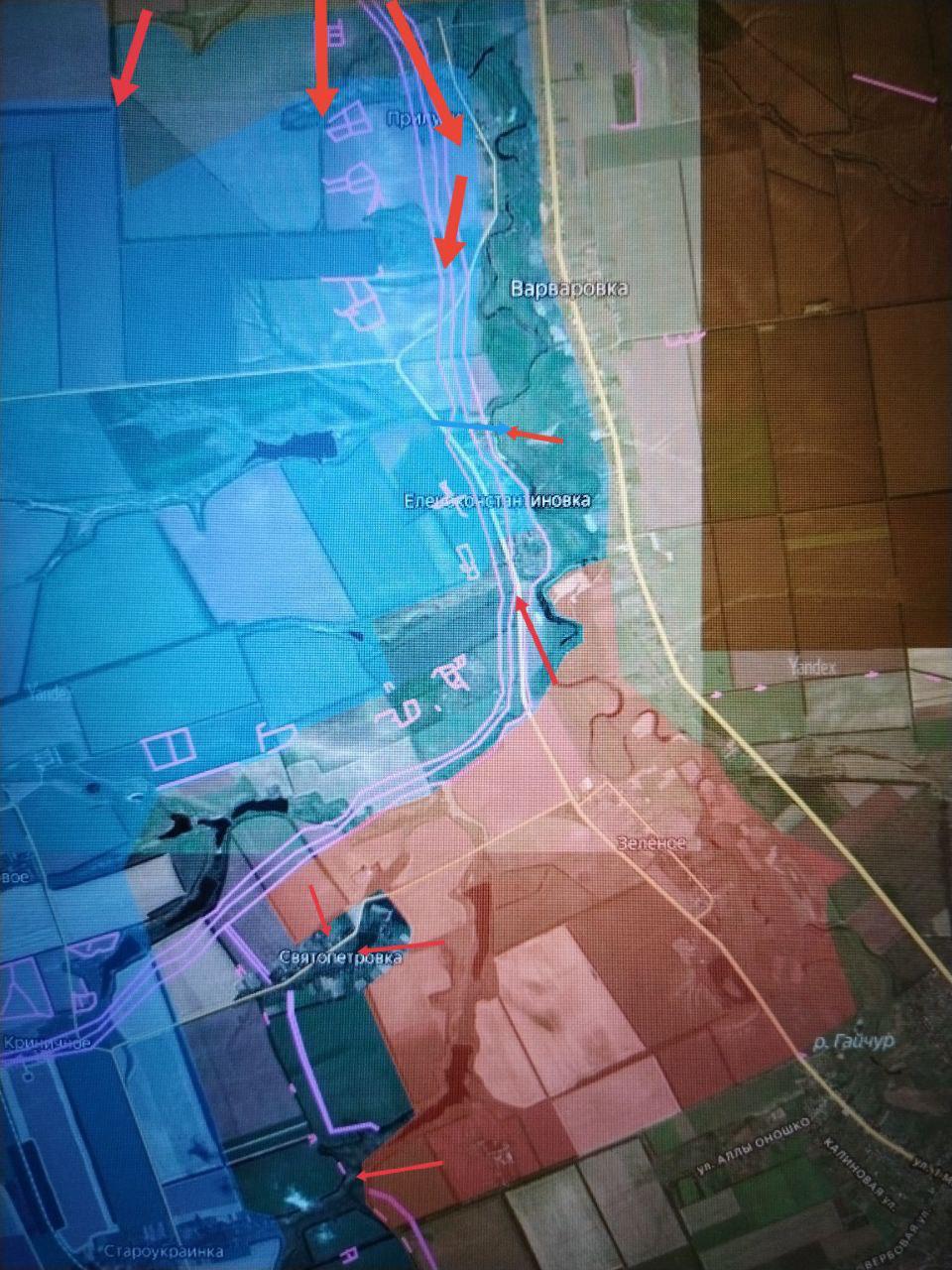 С плацдарма южнее Терноватого на территории Запорожской обл., за которое идут ожесточённые встречные бои, ВС РФ атакуют Придорожное, а также в направлении Рождественского и Воздвиженки, ведут бои за опорные пункты на высотах западнее с. Прилуки и продвигаются в направлении Еленоконстантиновки с севера. Наши подразделения ведут встречные бои в направлении последней со стороны Варваровки и Зелёного, которое также перешло под наш полный контроль накануне.
