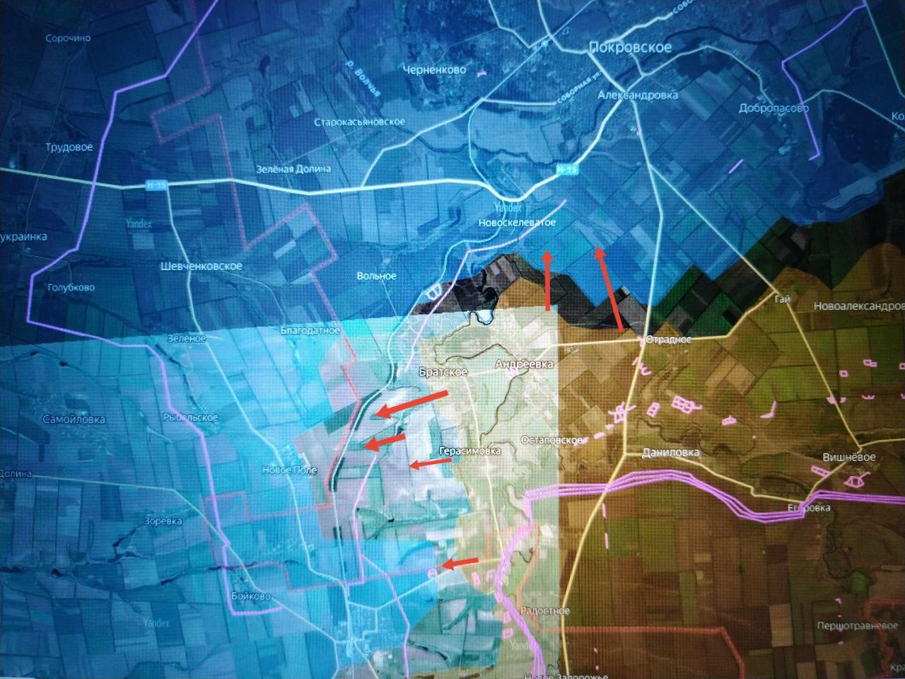 На северном фланге ВС РФ взяли под контроль Братское, пройдя практически всю южную часть Днепропетровской обл. (географически вклинивающуюся в Запорожскую с севера) и вышли к границе Запорожской обл. в районе Нового Поля, охватывая с севера Терноватое.