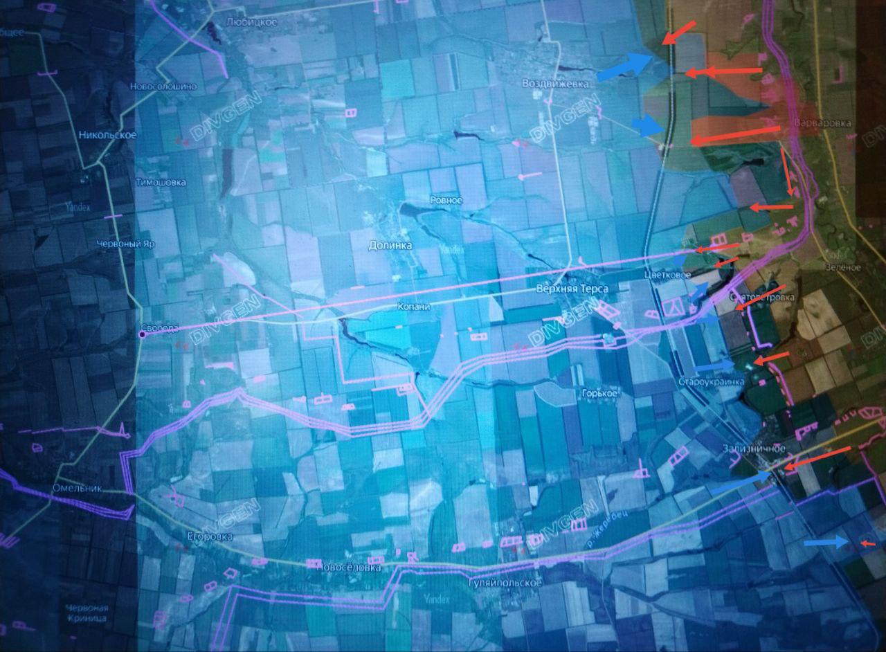 Южнее наши подразделения продвигаются, выбивая противника из опорных пунктов 3-го оборонительного рубежа в Запорожской области, юго-западнее Жовтневого (Еленоконстантиновки) в направлении Верхней Терсы и вышли на подступы к Цветковому.