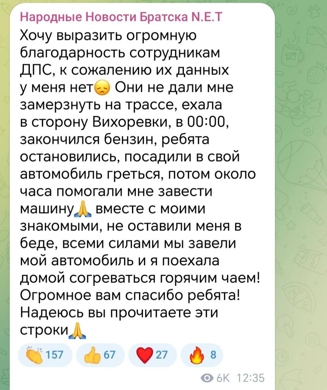 На улице стоял мороз в 40 градусов, вихоревчанка замерзла, поэтому инспекторы остались на месте и настояли на том, чтобы она дожидалась помощи в теплом служебном автомобиле.