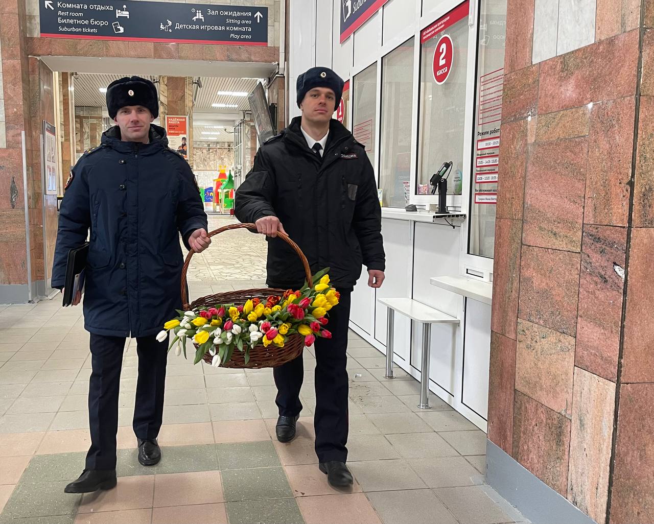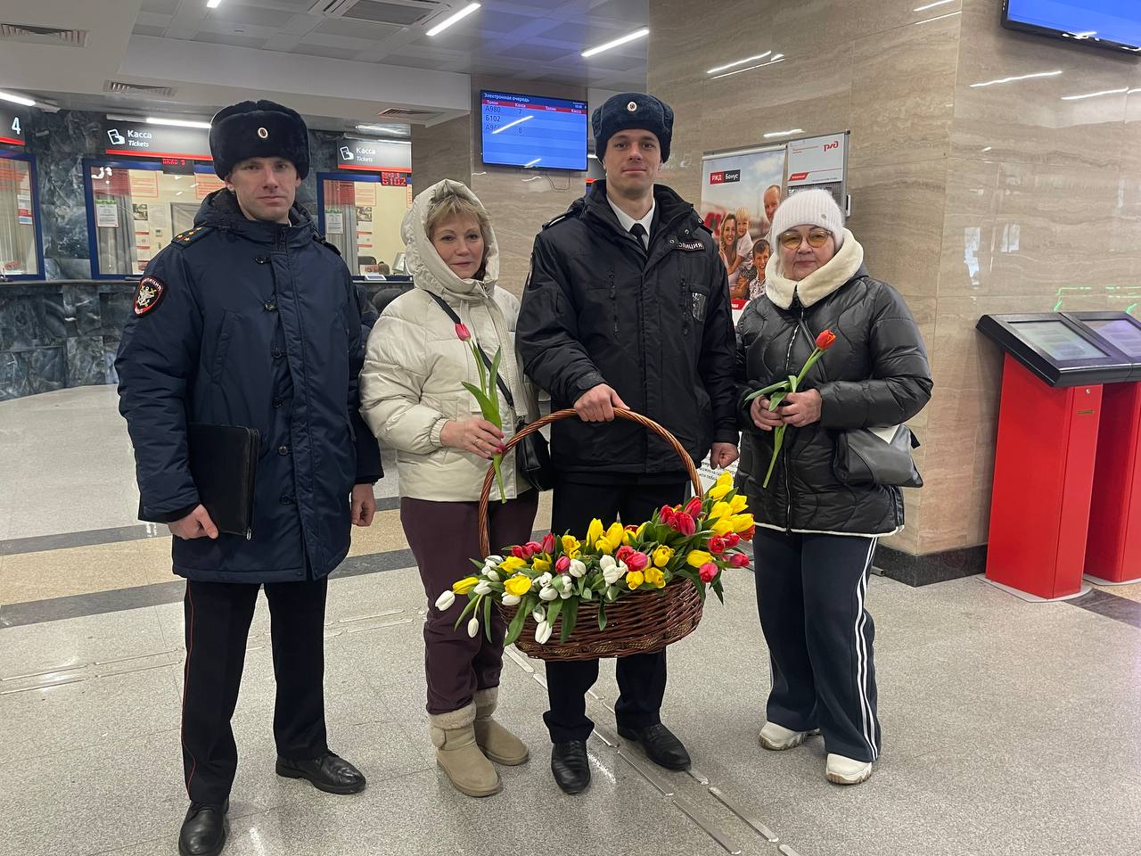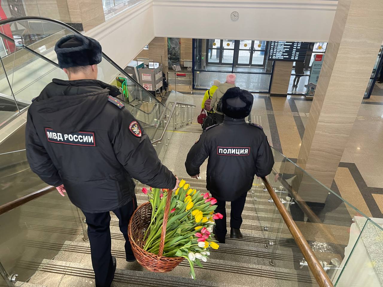 Праздничный патруль транспортных полицейских накануне Международного женского дня в ходе акции #8мартавкаждыйдом вручил сотрудницам вокзального комплекса и женщинам-пассажирам цветы. Стражи магистралей поздравили прекрасных дам с наступающим праздником, пожелали им всего самого доброго.