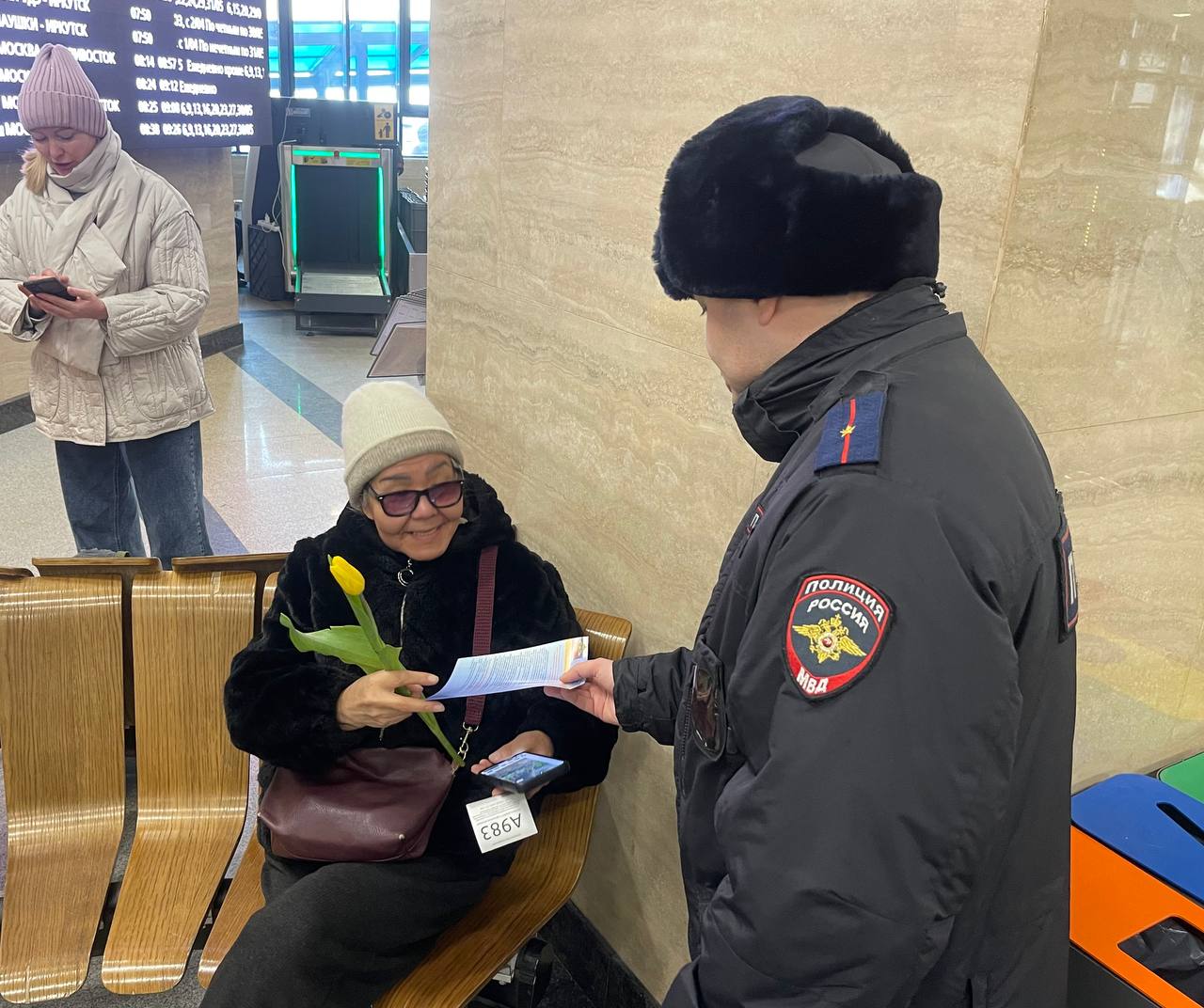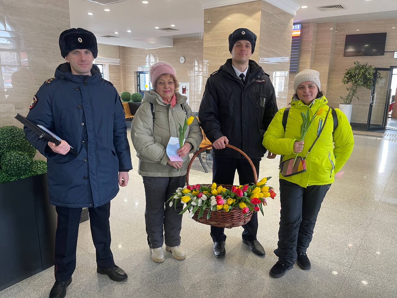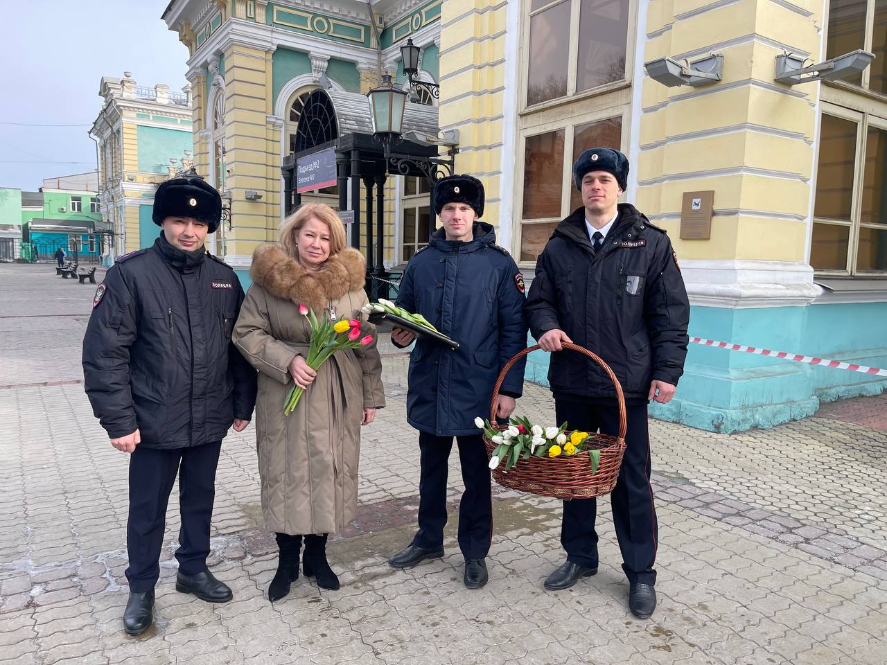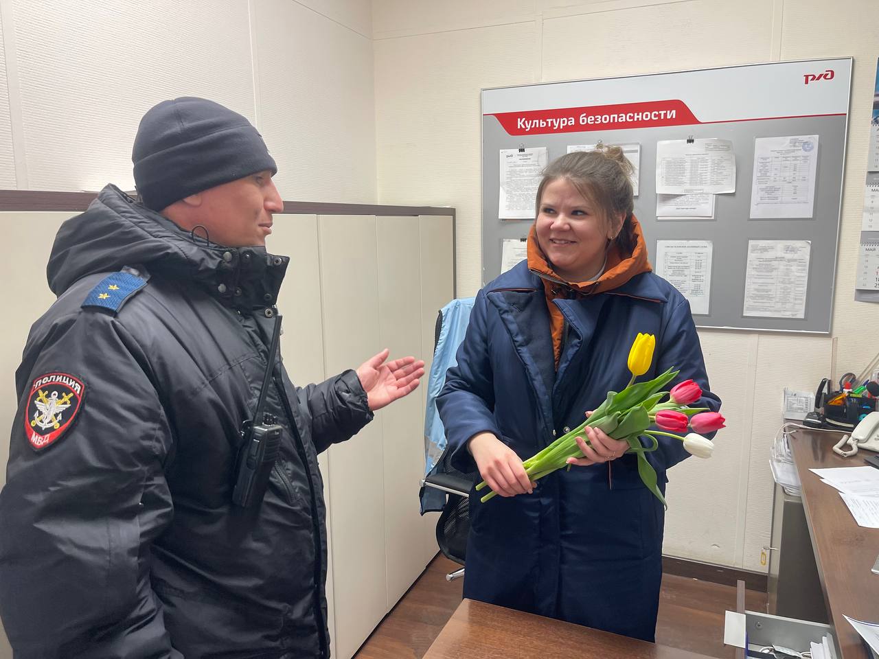 Праздничный патруль транспортных полицейских накануне Международного женского дня в ходе акции #8мартавкаждыйдом вручил сотрудницам вокзального комплекса и женщинам-пассажирам цветы. Стражи магистралей поздравили прекрасных дам с наступающим праздником, пожелали им всего самого доброго.