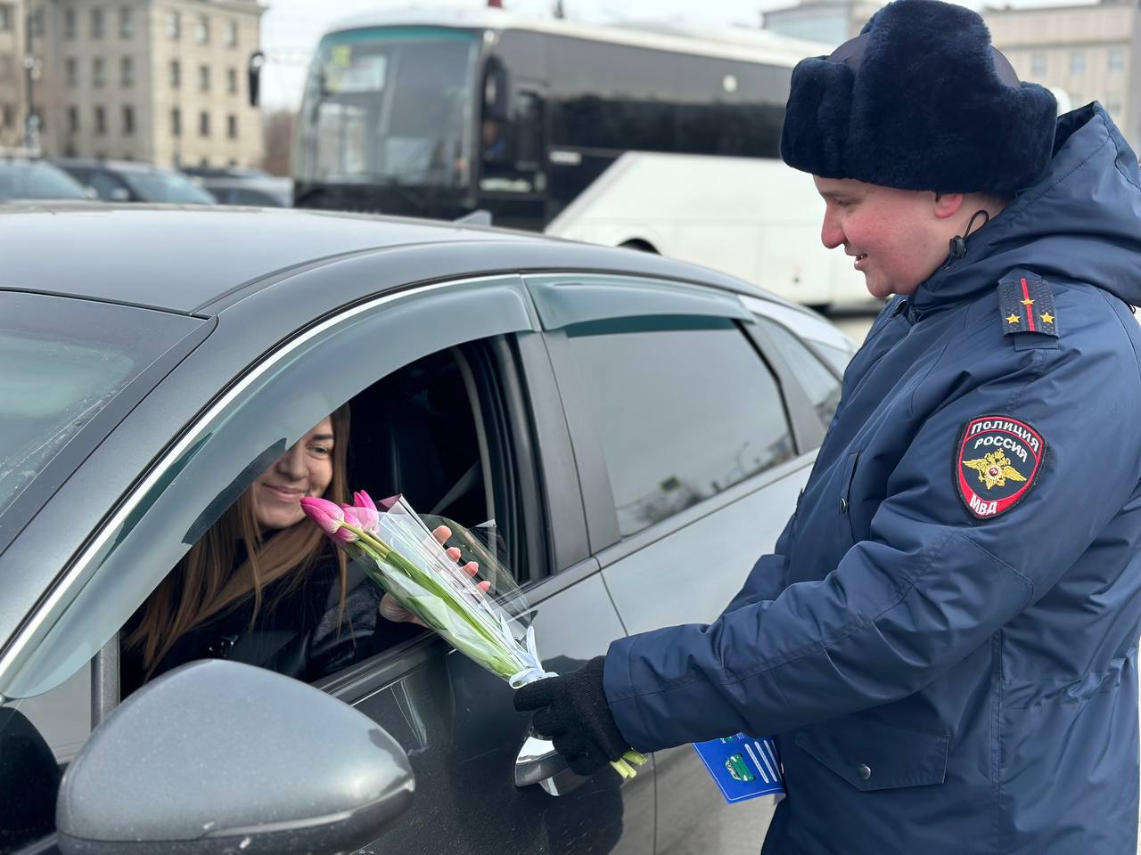 Вместо привычного требования предъявить водительское удостоверение, автоледи встречали искренние комплименты и весенние цветы.