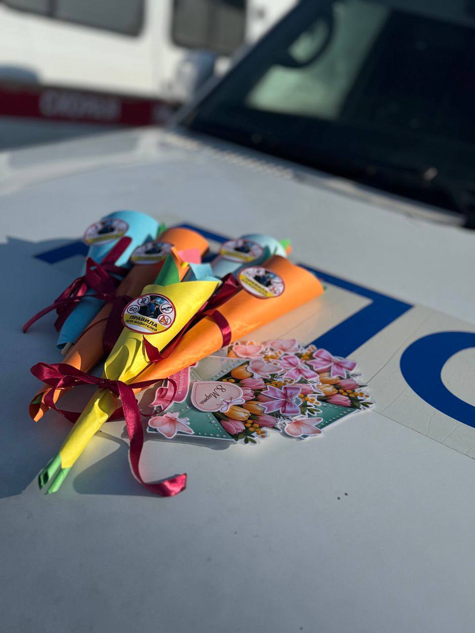 Сотрудники Госавтоинспекции с юными помощникам вручали цветы и поделки, сделанные своими руками как женщинам-водителям, так и пешеходам, просили быть внимательными и неукоснительно соблюдать правила дорожного движения.