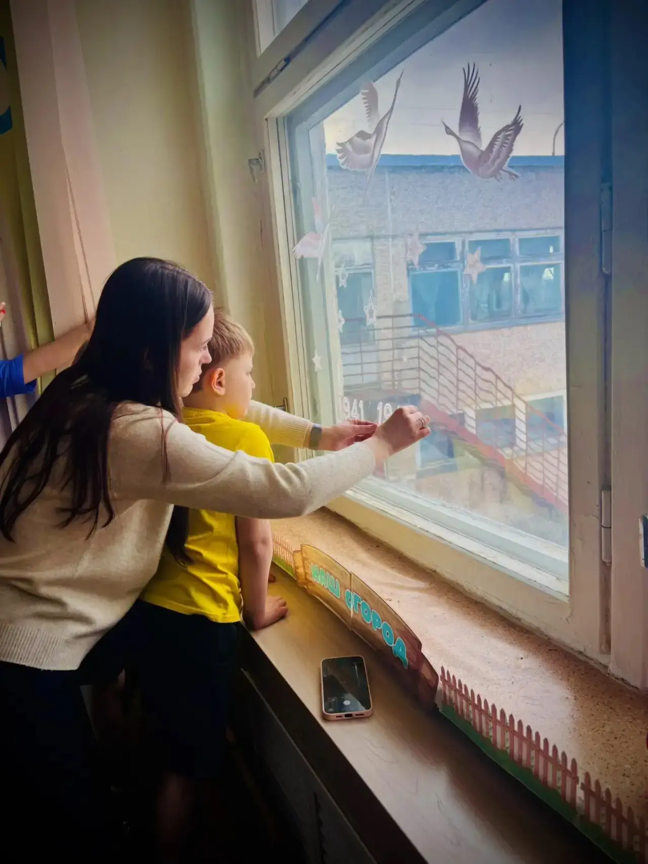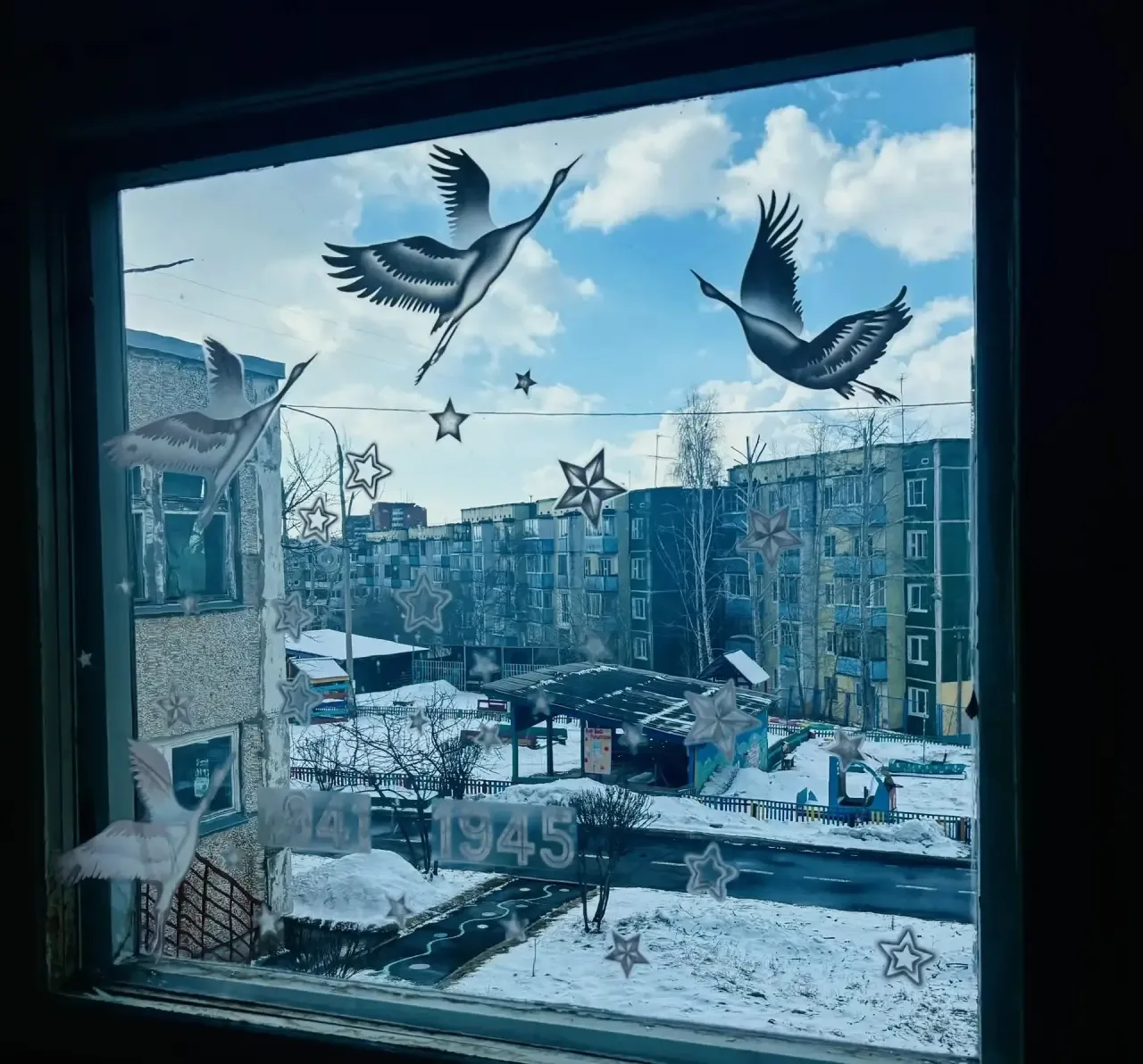 Участники акции оформили окна символами праздника. Здесь появились изображения цветов, георгиевских ленточек, вечного огня, голубей мира, журавлей и других символов Победы.