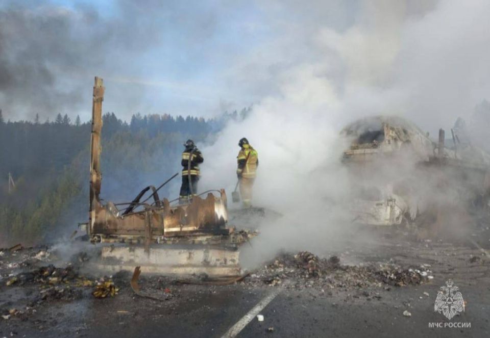 5 транспортных средств уничтожено в результате возгорания. Погиб водитель автовоза. На месте продолжают работать экстренные службы. Организован объезд всех видов транспорта через поселок Камышет. Комментирует начальник отдела Госавтоинспекции ОМВД...