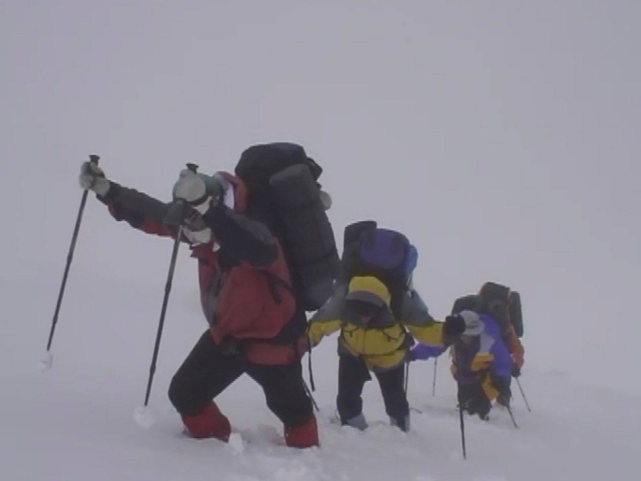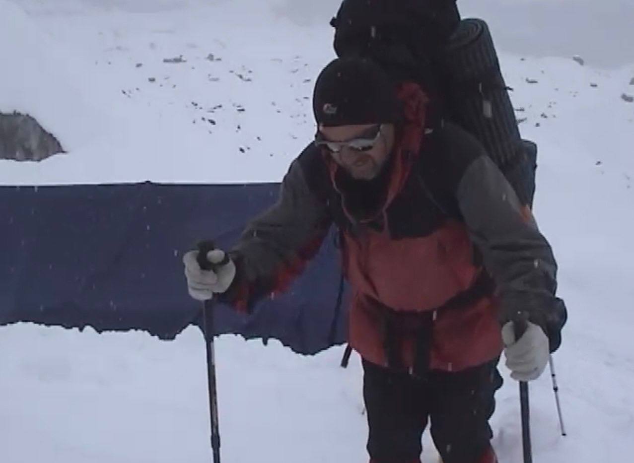 Еще был серьезный срыв, и нашу связку спас Женя Виноградский, который в силу опыта, невероятного чутья во время привала ледорубом выбил лунку и успел воткнуть в нее ледоруб со страховочной системой.