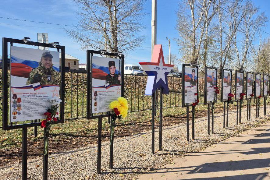 Рядом размещены именные стенды, посвящённые жителям Осинского района, погибшим в зоне СВО.