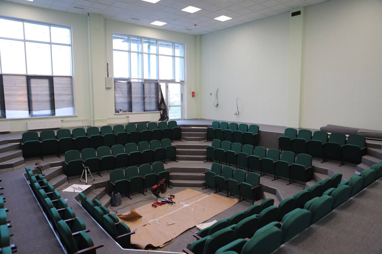 Также, параллельно с этим, специалисты монтируют подвесные потолки и светильники, укладывают линолеум, устанавливают плинтусы. В нескольких классах уже приступили к сборке мебели.