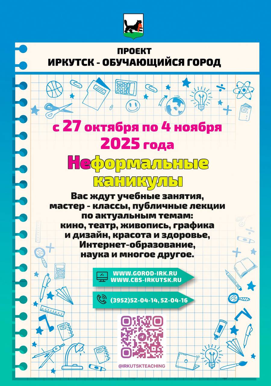 – «Неформальные каникулы» впервые прошли в 2013 году. Они являются частью проекта «Иркутск – обучающийся город», который направлен на привлечение жителей всех возрастов к новым формам образования. Основная цель – организация семейного досуга во время школьных каникул, – уточнили в мэрии.