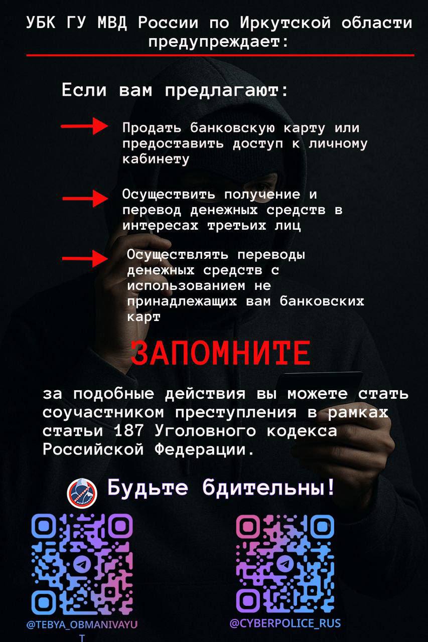 Сотрудники УБК ГУ МВД Росси по Иркутской области напоминают об уголовной ответственности за продажу банковской карты третьим лицам