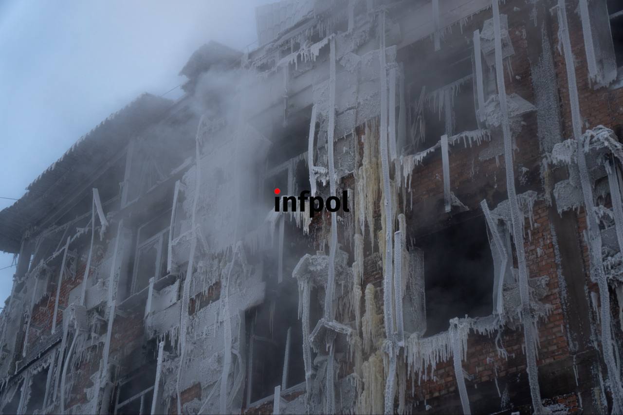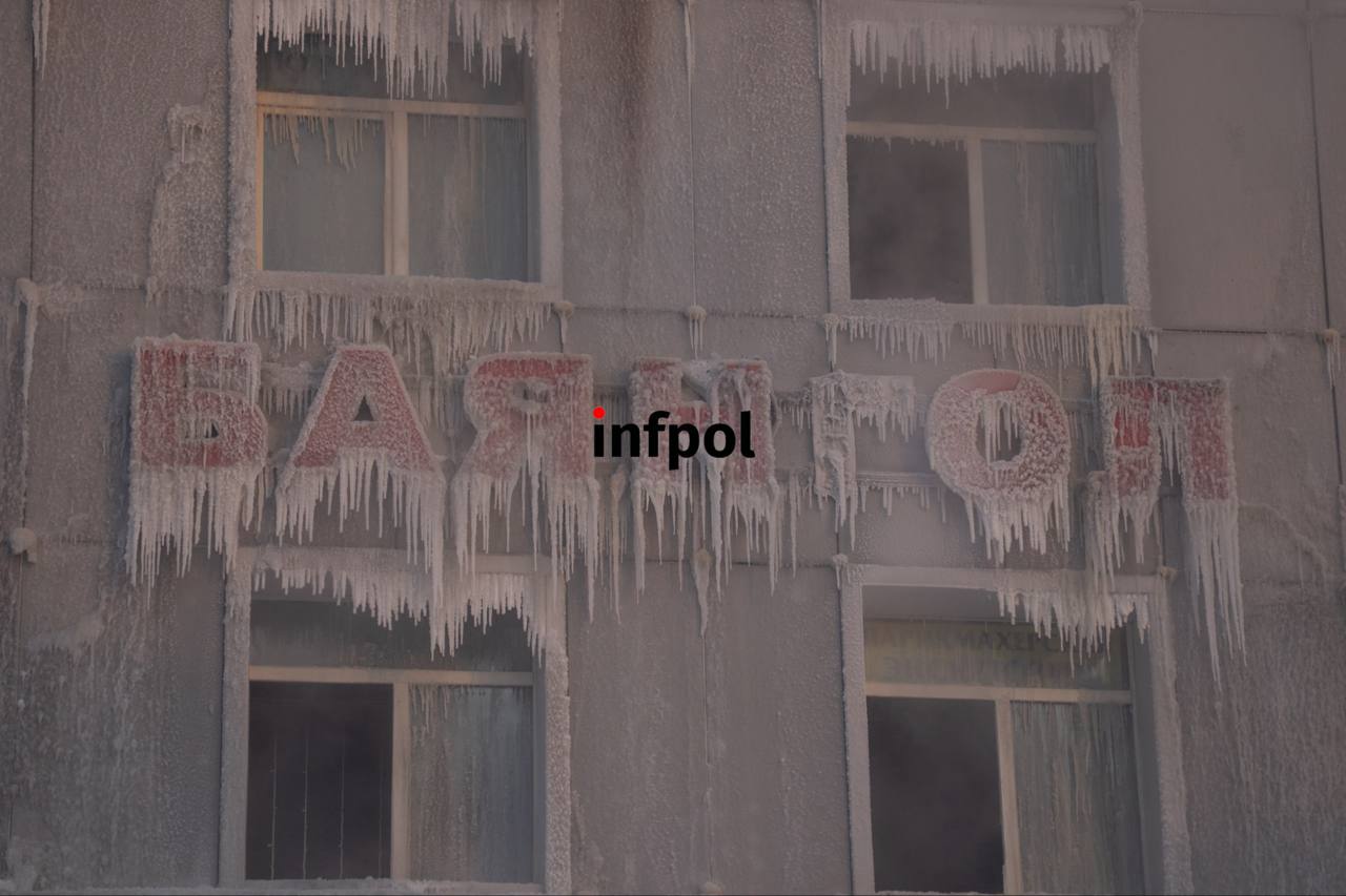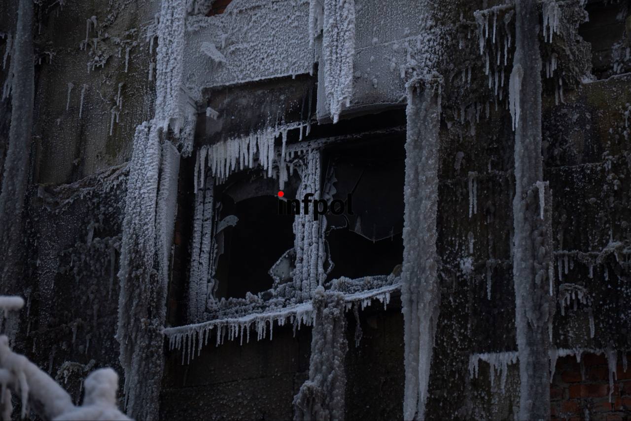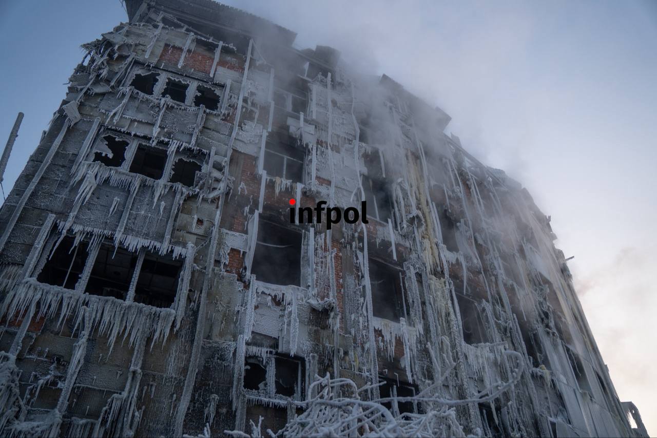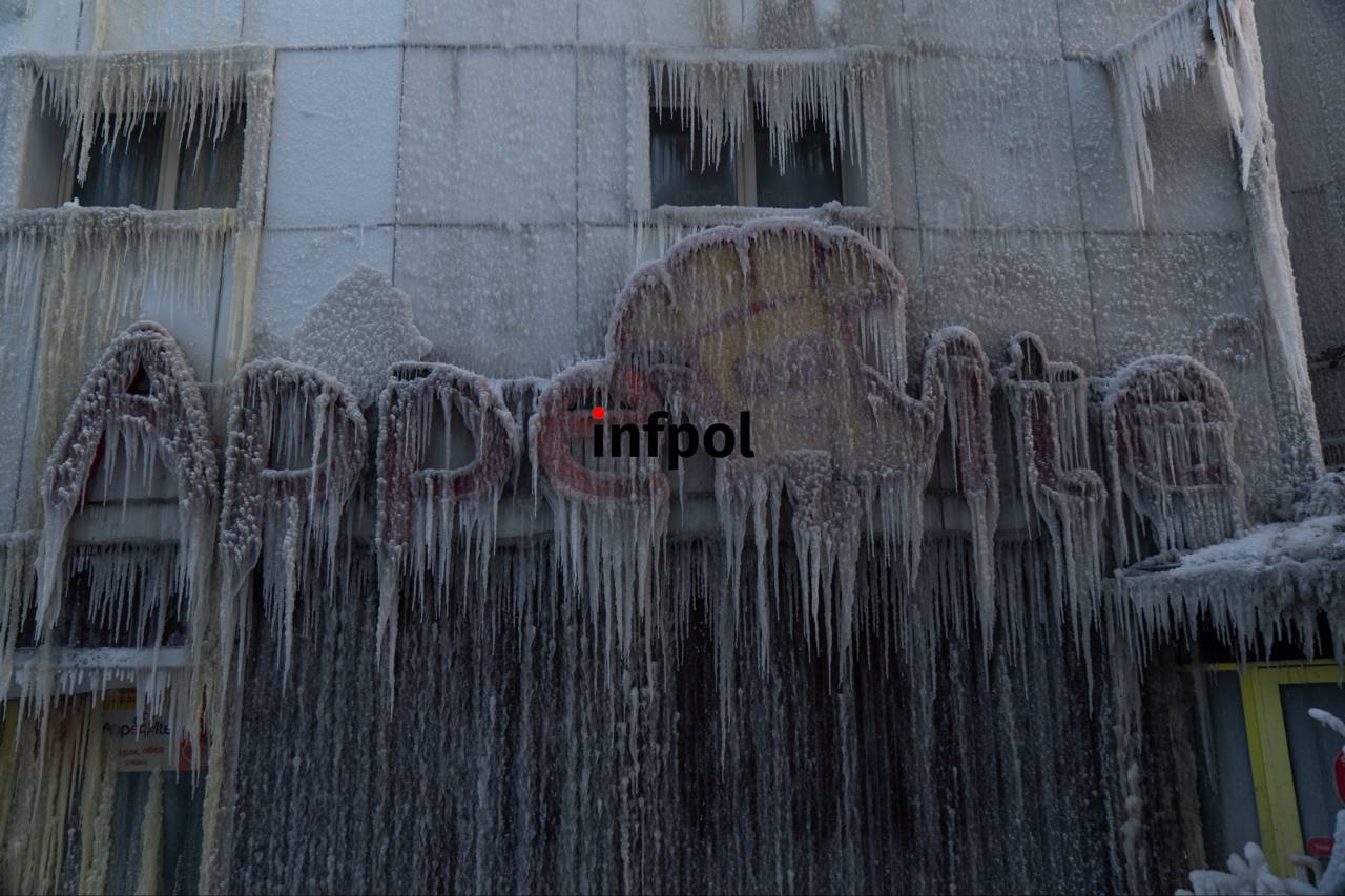 После многочасового тушения центр превратился в огромный айсберг. Из него до сих пор идет дым, а все вокруг покрылось льдом.На месте продолжают трудиться пожарные.