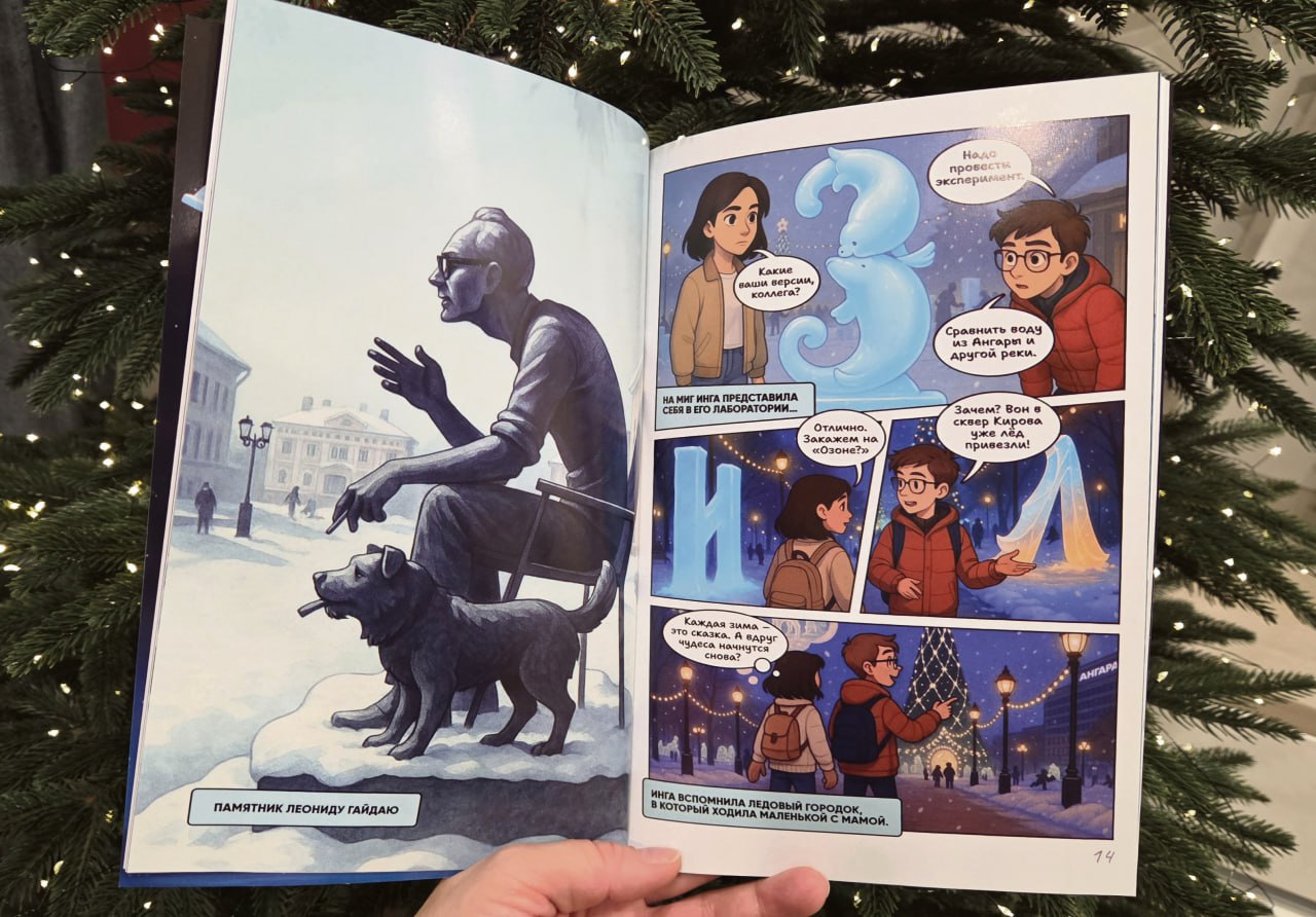 Помните ледяной город 2023 года? Тогда Иркутск наполнили фигуры изо льда, а в сквере Кирова скульпторы сваяли из него 33 буквы русского алфавита, каждая из которых содержала иркутскую символику. Фестиваль проходил под эгидой масштабного городского проекта «Счастье чистой воды», а его ледяные буквы не растаяли, а переселились на страницы комикса. Вместе с ними туда попали и мастера-ледорубы, а главные роли заняли одноклассники Инга и Рома.
