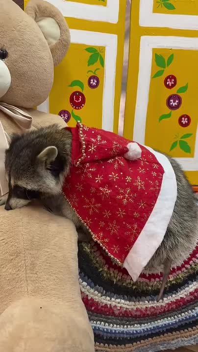 Енот Наташа из Сибирского зоопарка ищет у медведя новогоднее настроение... и кажется находит.