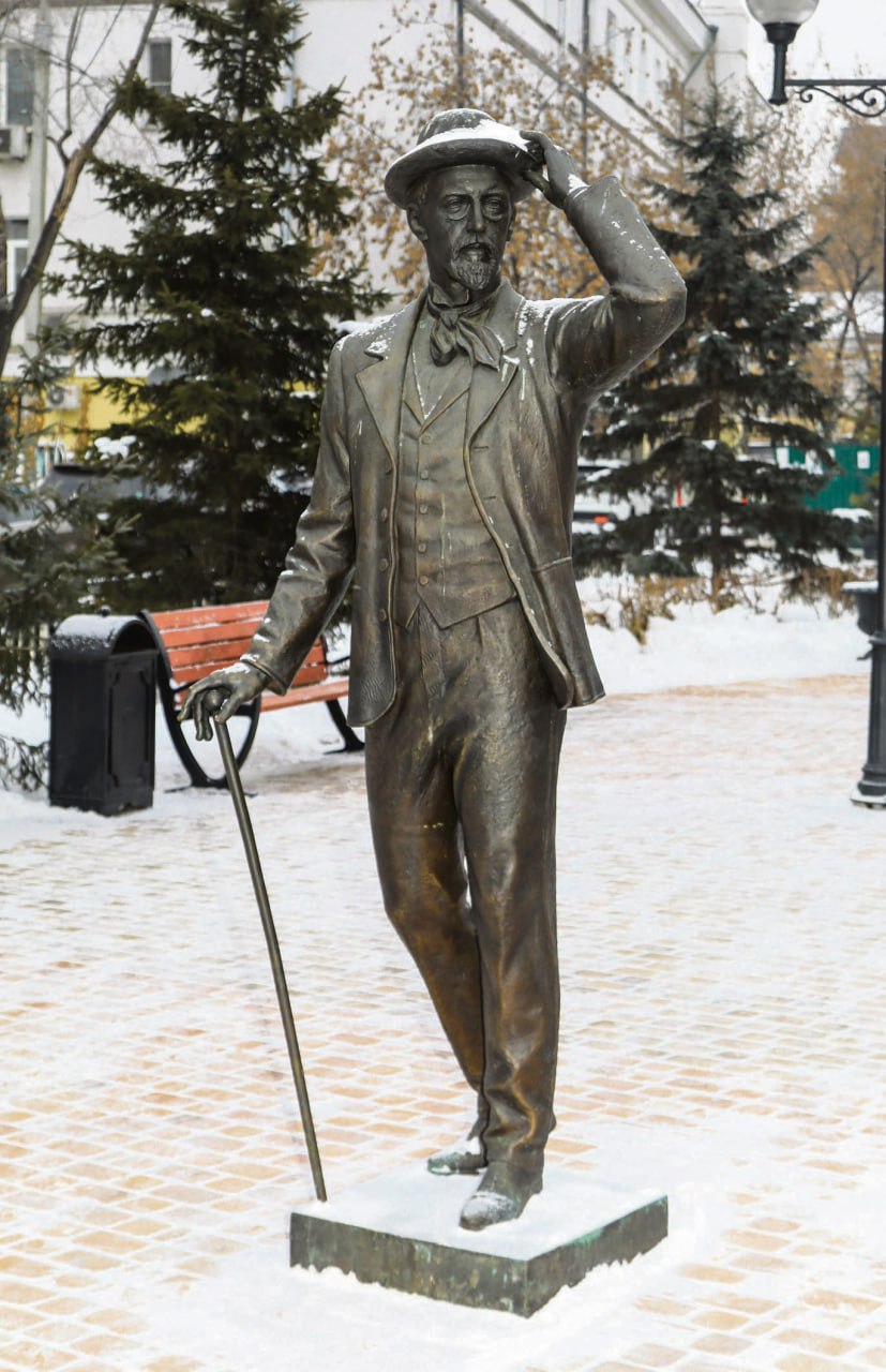 — Люблю Антона Павловича Чехова. Как его можно не любить? Он словно писал для нашего времени: коротко, интересно, с юмором. И главное, всегда актуально. Писатель побывал в нашем городе летом 1890 года, прожил здесь неделю по дороге на Сахалин. Еще со времен советского школьного детства многим из нас практически наизусть известна комплиментарная цитата из его письма матери и сестрам от 6 июня 1890 года: «Иркутск — превосходный город. Совсем интеллигентный. Театр, музей, городской сад с музыкой, хорошие гостиницы. Нет уродливых заборов, нелепых вывесок и пустырей с надписями о том, что нельзя останавливаться. Есть трактир «Таганрог». Сахар 24 коп., кедровые орехи 6 коп. за фунт. <…> В Иркутске рессорные пролетки. Он лучше Екатеринбурга и Томска. Совсем Европа». Устроить сквер Антона Павловича в Иркутске придумали в 2019 году жители улиц Карла Маркса и Чехова. В центре установили бронзовую фигуру писателя, ее авторы — Илья и Евгений Ставские, сын и отец, известные в Иркутске скульпторы. Образ Антона Павловича каноничен и узнаваем: пенсне, шляпа, тросточка.
