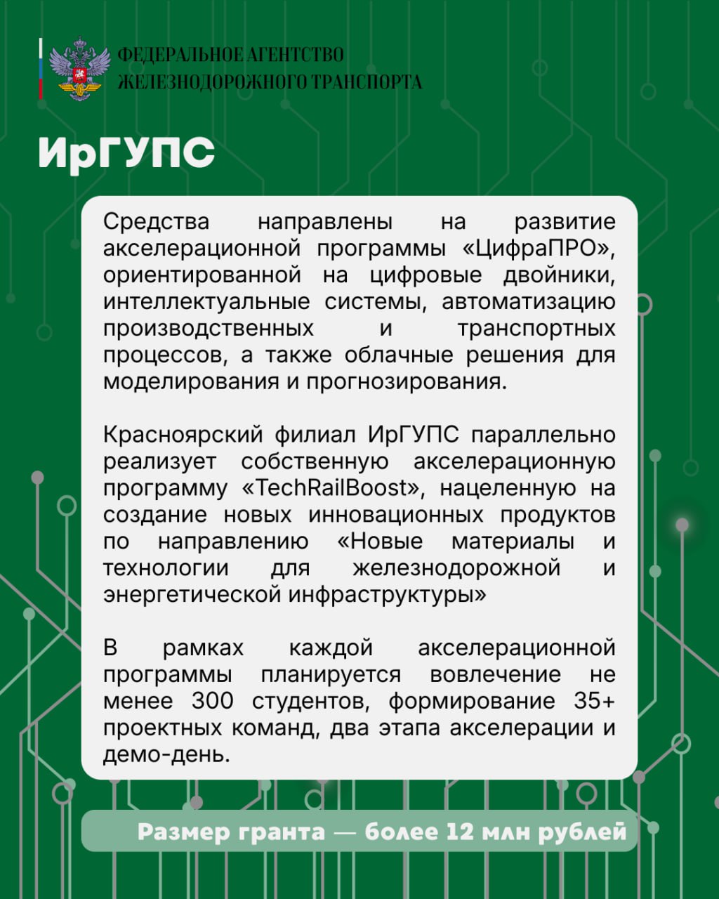 ИрГУПС пятый год подряд выигрывает гранты Платформа НТИ. В 2026 году университет получит более 12 млн рублей на реализацию двух акселерационных программ — в головном вузе и Красноярском институте железнодорожного транспорта. Каждая предполагает участие не менее 300 студентов, формирование более 35 проектных команд и проведение демо-дня с участием индустриальных партнёров.