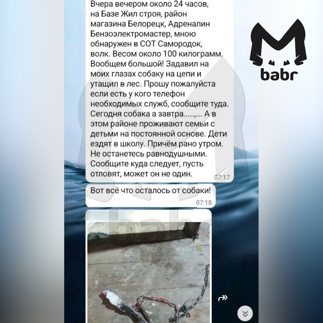 По словам заммэра Евгения Старикова, это очень большая самка. Местные говорят, видели её и в 10-м микрорайоне, возле базы отдыха "Медвежий угол" — там хотела утащить ещё одну собаку. Мужики спугнули её снегоходом, она убежала в сторону города. Сейчас волчицу ищут охотоведы.