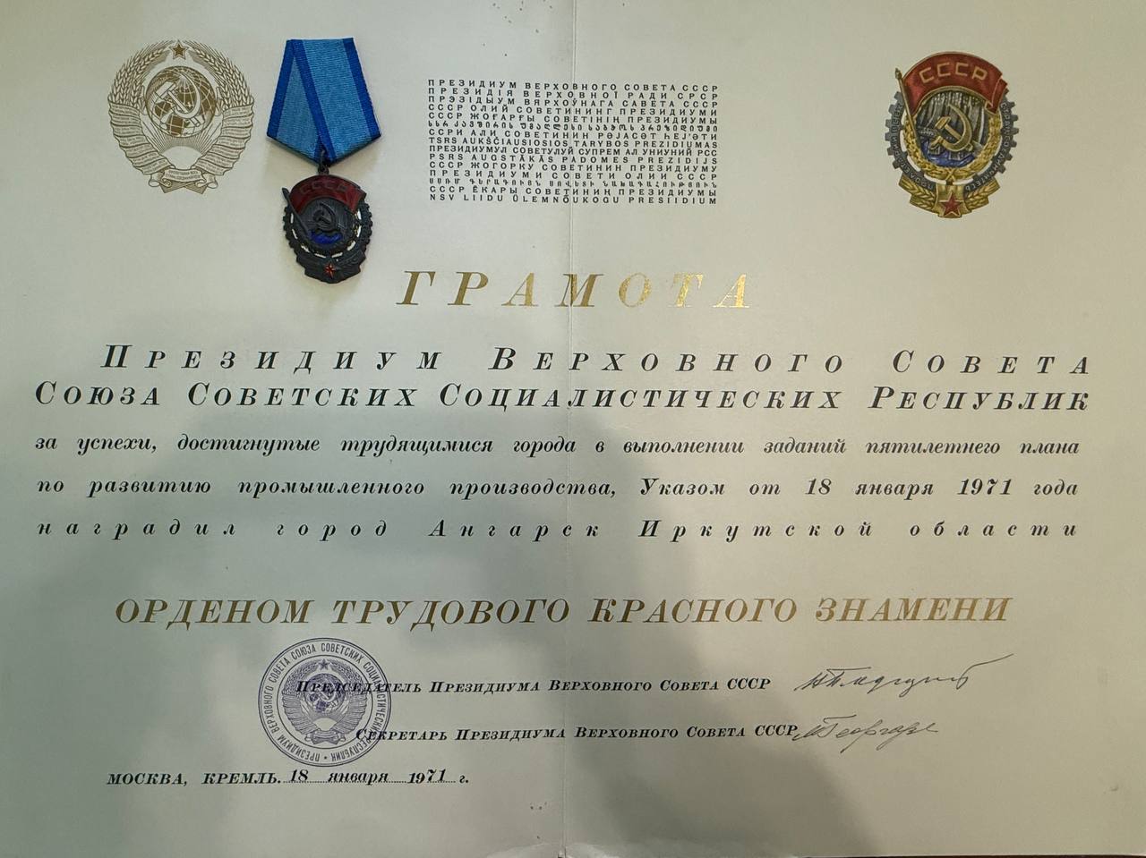Увидеть документальные кадры торжественной церемонии вручения Ангарску ордена Трудового Красного Знамени можно по ссылке.