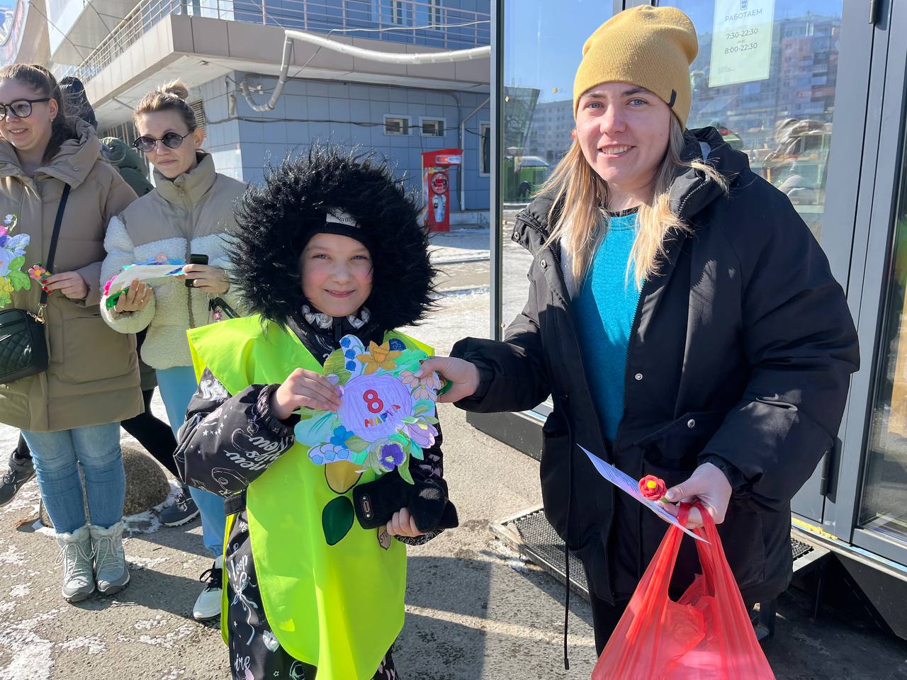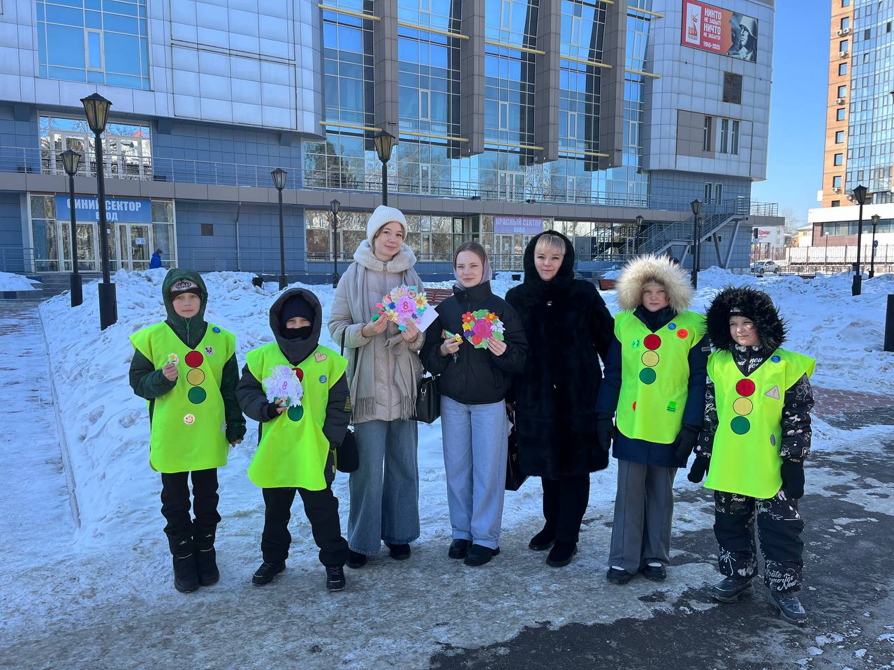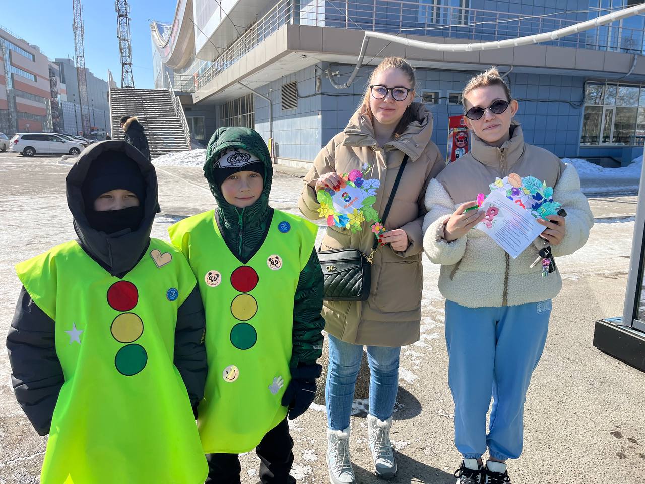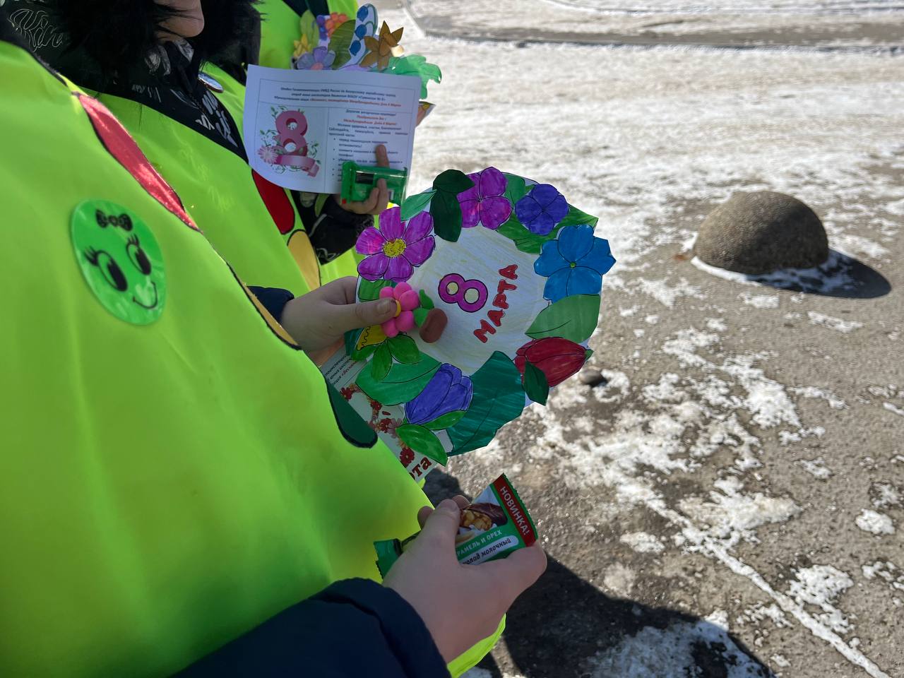 «Мы юные инспекторы гимназии 8, поздравляем Вас с наступающим 8 Марта, желаем весеннего настроения, напоминаем о соблюдении правил дорожного движения, особенно в качестве пешеходов. Помните! Что переходить дорогу нужно строго по пешеходному переходу, заранее убедившись в безопасности и ждать полной остановки транспорта, а также не отвлекаться на телефоны» - говорили ЮИДовцы.