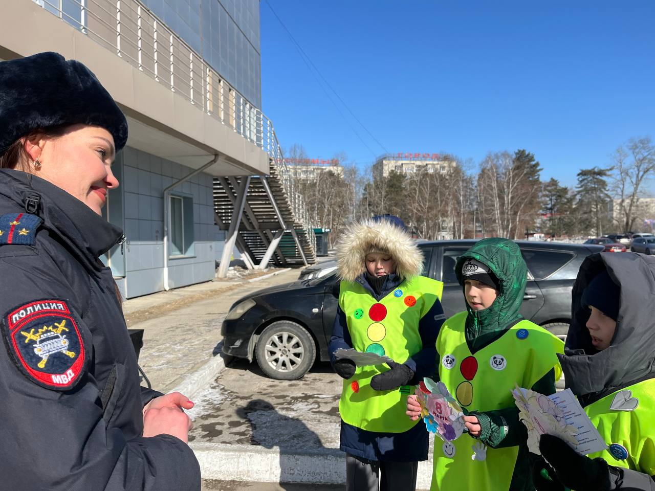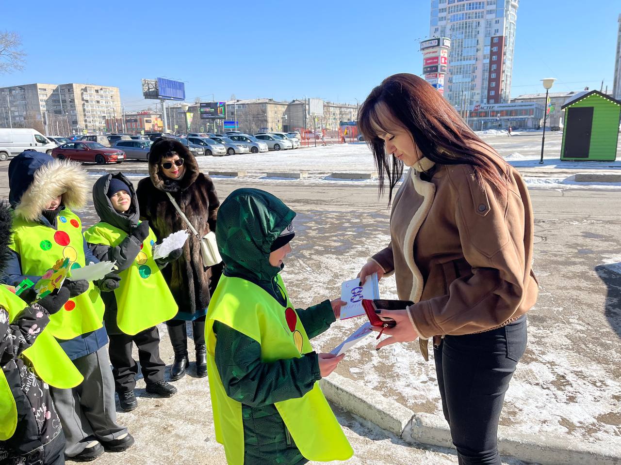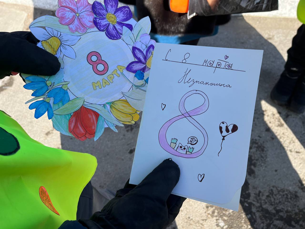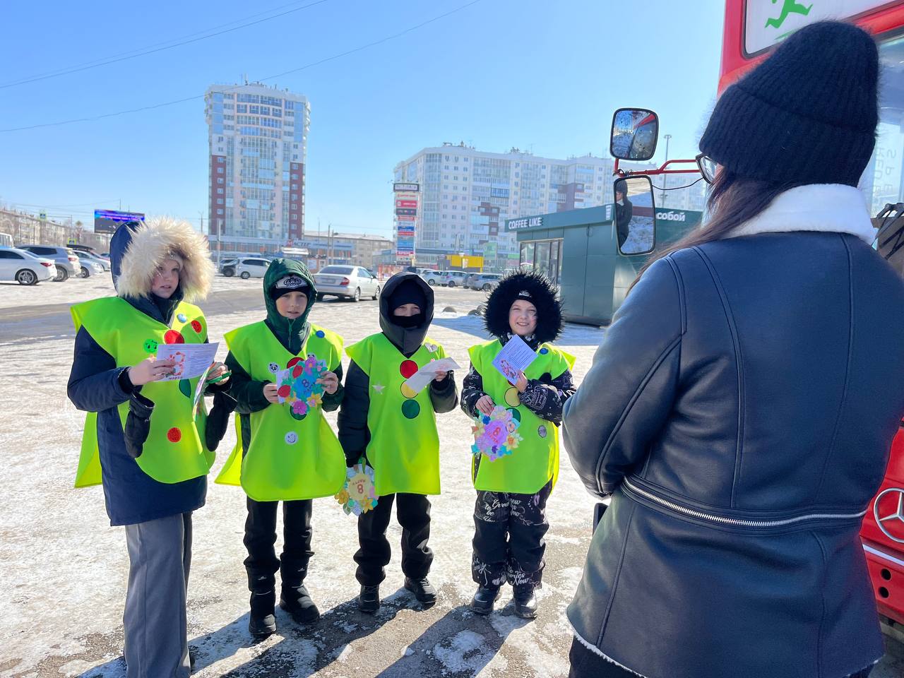 «Мы юные инспекторы гимназии 8, поздравляем Вас с наступающим 8 Марта, желаем весеннего настроения, напоминаем о соблюдении правил дорожного движения, особенно в качестве пешеходов. Помните! Что переходить дорогу нужно строго по пешеходному переходу, заранее убедившись в безопасности и ждать полной остановки транспорта, а также не отвлекаться на телефоны» - говорили ЮИДовцы.