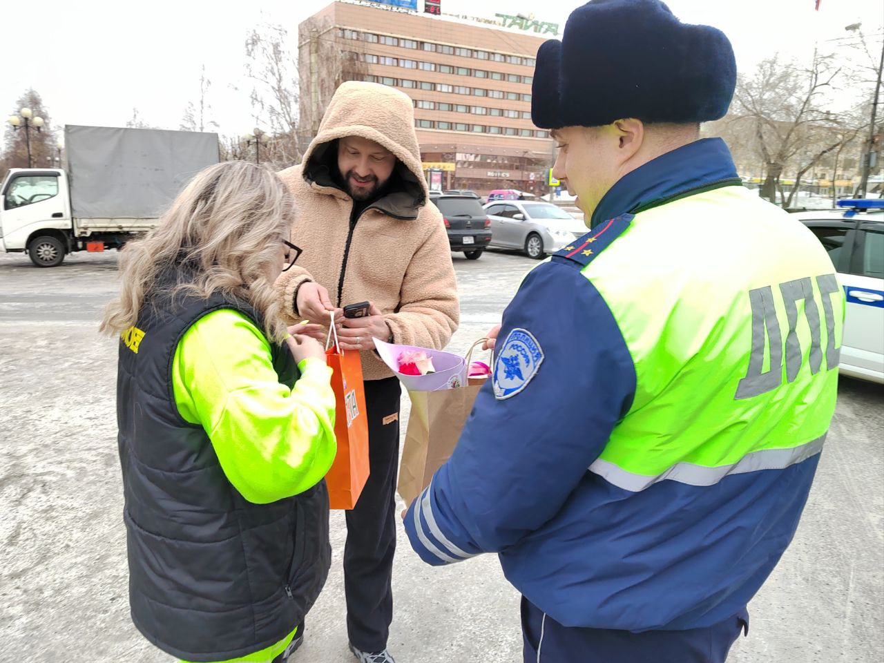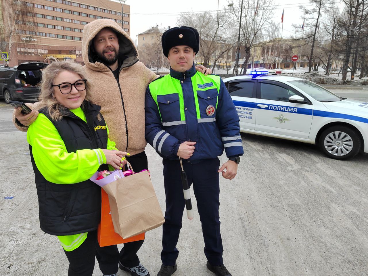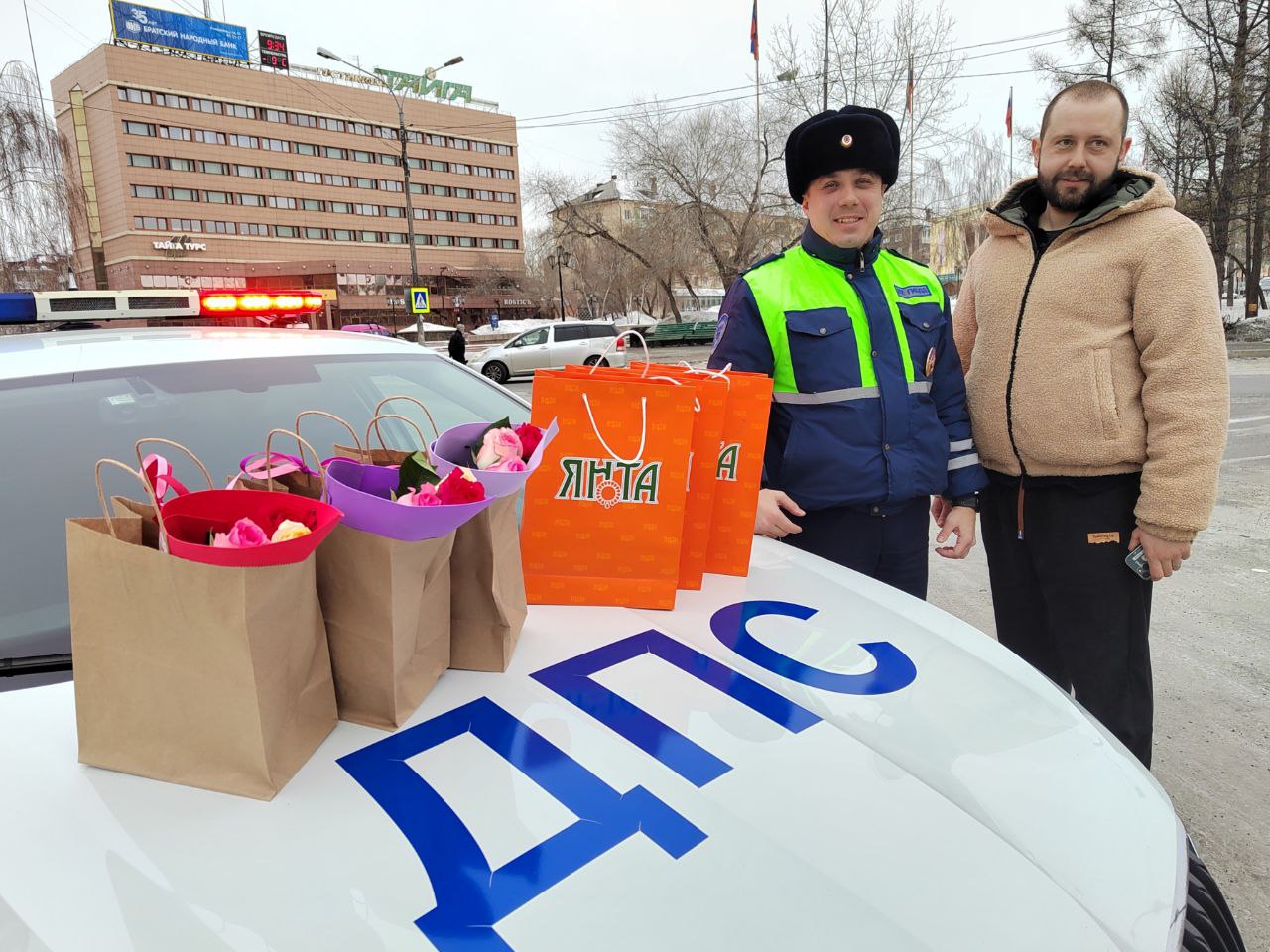 Старший лейтенант полиции Иван Захаров и диджей радиостанции «Голос Ангары» Андрей Дубровин останавливали автомобили, чтобы поздравить женщин-водителей с 8 марта! Они вручали автомобилисткам цветы и подарки и напоминали о соблюдении правил дорожного движения. Каждая автоледи уезжала с улыбкой, хорошим настроением, а также напутствием быть внимательнее на дороге, беречь себя и соблюдать правила дорожного движения.