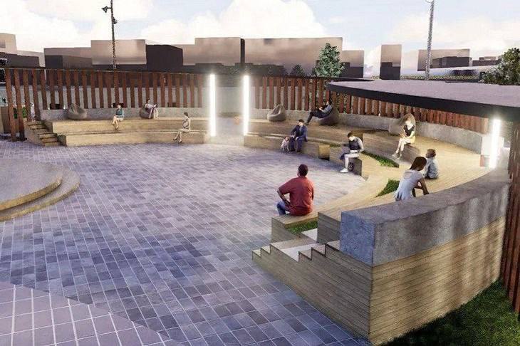 Для культурных мероприятий обустроят амфитеатр и летнюю эстраду. Сквер украсят клены и кусты сирени. Также установят перголу с колоннами и подсветкой, уложат резинопол и смонтируют наружное освещение.