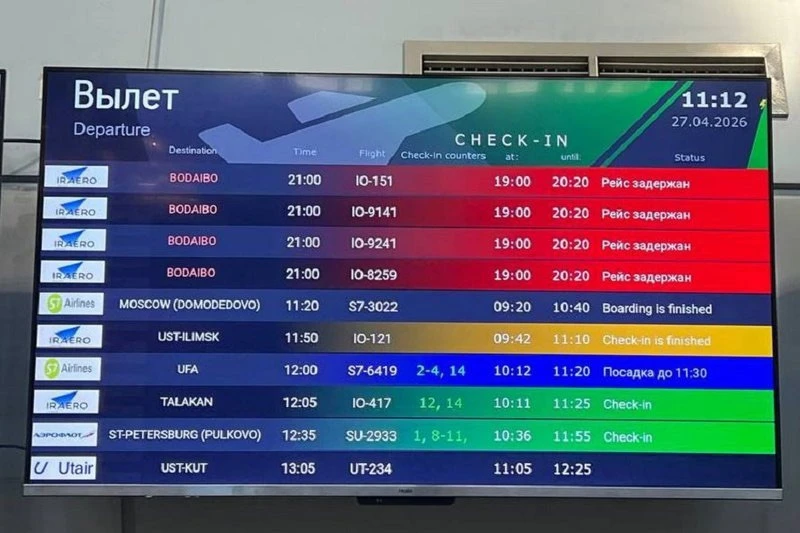 В аэропорту Иркутска 27 апреля задержали рейсы IO151, IO9141, IO9241, IO8259 в Бодайбо. Их обслуживает авиакомпания «Ираэро». По предварительным данным, вылеты перенесли на утро 28 апреля с учетом метеоусловий в городе.