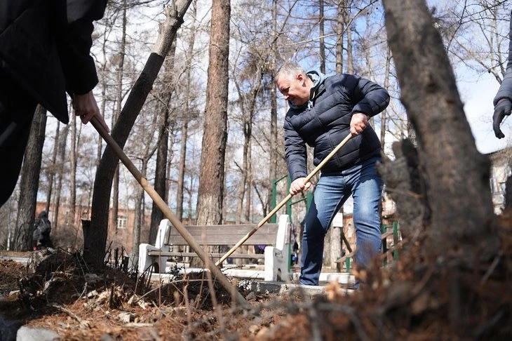 Игорь Кобзев принял участие в субботнике на территории военного госпиталя в Иркутске