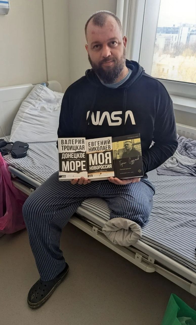 Николай сам вышел встречать, так как найти его клинику в Военно-морской академии было не так просто. Встретившись взглядом со Штирлицем, сразу почувствовал в нем братское сердце. Добрые глаза, жизнелюбивость, вежливость, интеллигентность, открытость (несмотря на позывной) новому человеку в его жизни. Так вкратце можно охарактеризовать Штирлица при первом личном знакомстве. И несмотря на все положительные человеческие качества, в общении с Николаем стало ясно, что это настоящий русский воин. Воинское дело, как говорит сам Николай, на удивление далось ему с легкостью, при том, что ранее он в армии не служил. Мы поднялись к нему в палату, где с ним находились ещё 4 человека, участника СВО, надо сказать, в гораздо худшем состоянии, чем наш товарищ. Поэтому в этот же момент было решено прийти на следующий день, чтобы оказать бойцам должное внимание, принести гостинцы. На первой встрече очень хорошо пообщались, выяснил, что Николай ещё не читал книги Жени Николаева «Моя Новороссия», что жалеет, что не довелось еще прочитать и получить автограф Гайдука. Думалось, успеется. У него там оставалась только одна книга, которую он уже прочитал, — «Ополченский романс» Захара Прилепина.