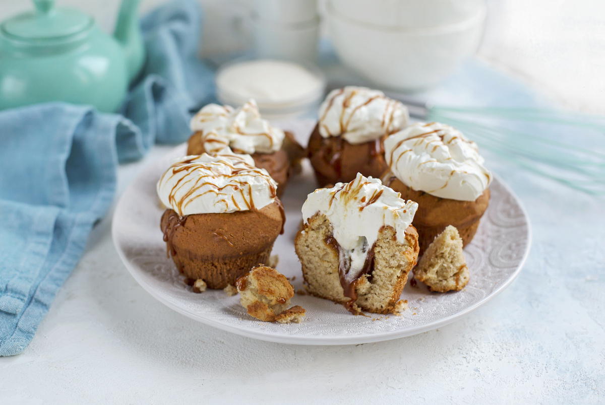 Шаг 2: В отдельной миске соединить муку с разрыхлителем. Постепенно добавлять смесь в банановое тесто, не прекращая взбивание. Добавить корицу и ванильный сахар. Заполнить формочки тестом, выпекать в течение 25-30 минут, проверить готовность зубочисткой и остудить. Сделать небольшие ямки в верхней части кексов с помощью ножа, чтобы можно было налить карамель.
