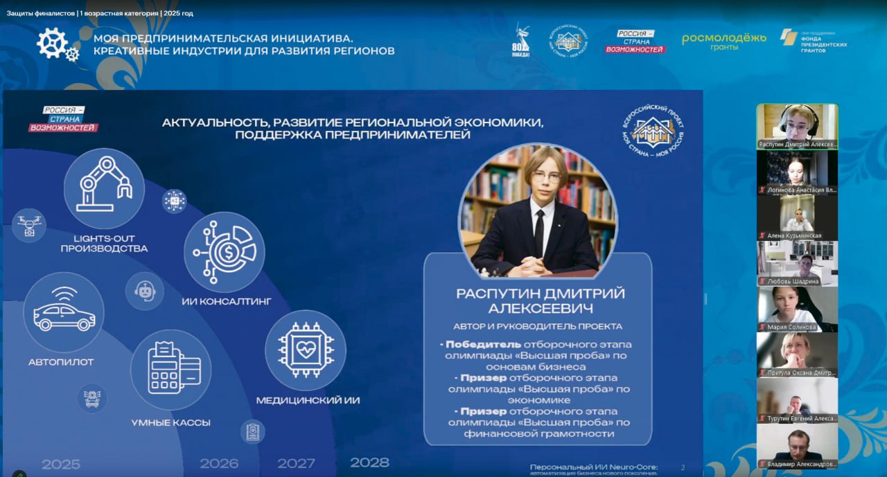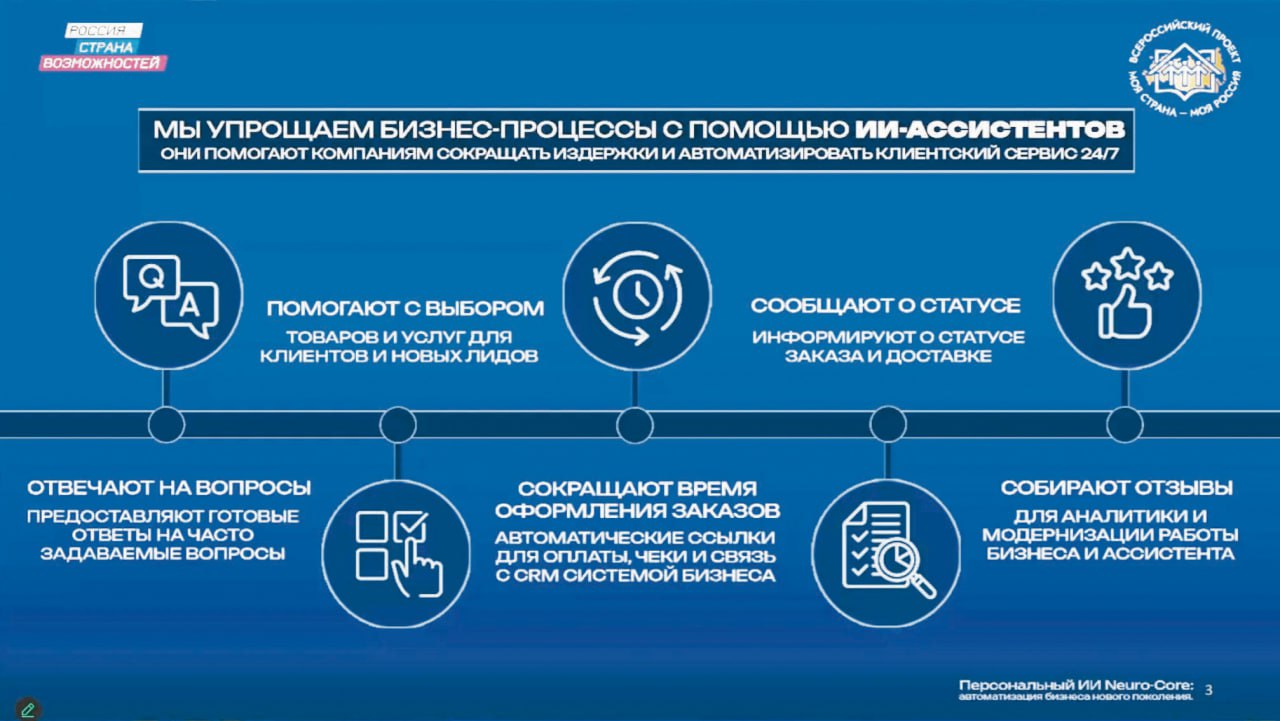Всего на конкурс подали заявки 74 369 человек, в финал попали 300 из них. Дмитрий представил проект Neuro-Core — рабочую модель по созданию умных ассистентов-ботов для помощи малому и среднему бизнесу.