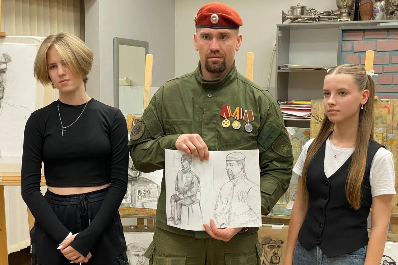 В рамках акции участники СВО встречаются со школьниками, которые во время беседы рисуют их портреты.