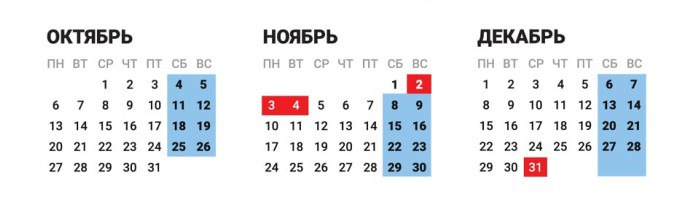 Она будет с 27 октября по 1 ноября. Но есть и хорошие новости: суббота 1 ноября будет сокращенной и рабочий день продлится на час меньше.