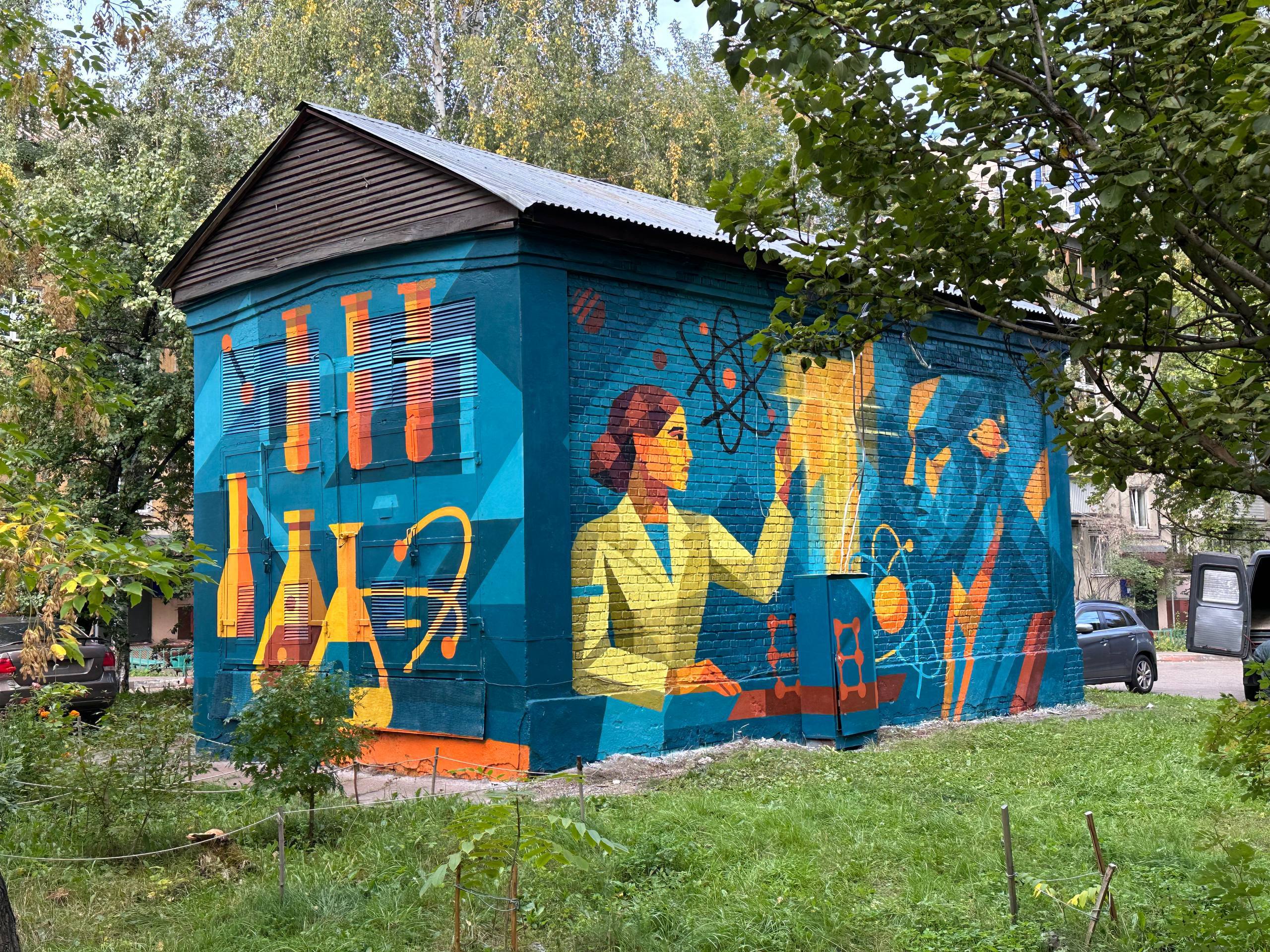 «Этот небольшой мурал — история о людях, которые исследуют мир и делятся открытиями. Каждая сторона — отдельная глава: от опытов в лаборатории до тайн космоса и красоты природы.Этот проект напоминает, что любознательность и желание учиться — в сердце каждого из нас. Здесь атомы соседствуют с книгами, орбиты — с пробирками, а формулы — с очертаниями деревьев»