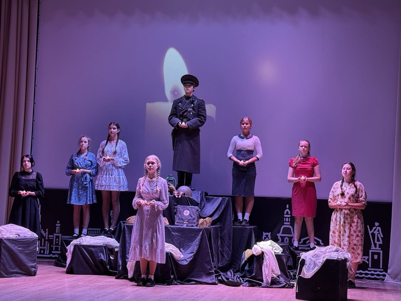 В основу спектакля легли документальные истории из книги Светланы Алексиевич «У войны не женское лицо». В течение 40 минут участники школьного театра «МИГ» создавали на сцене пронзительные образы женщин-медиков, чей героизм и самопожертвование стали символом военных лет.