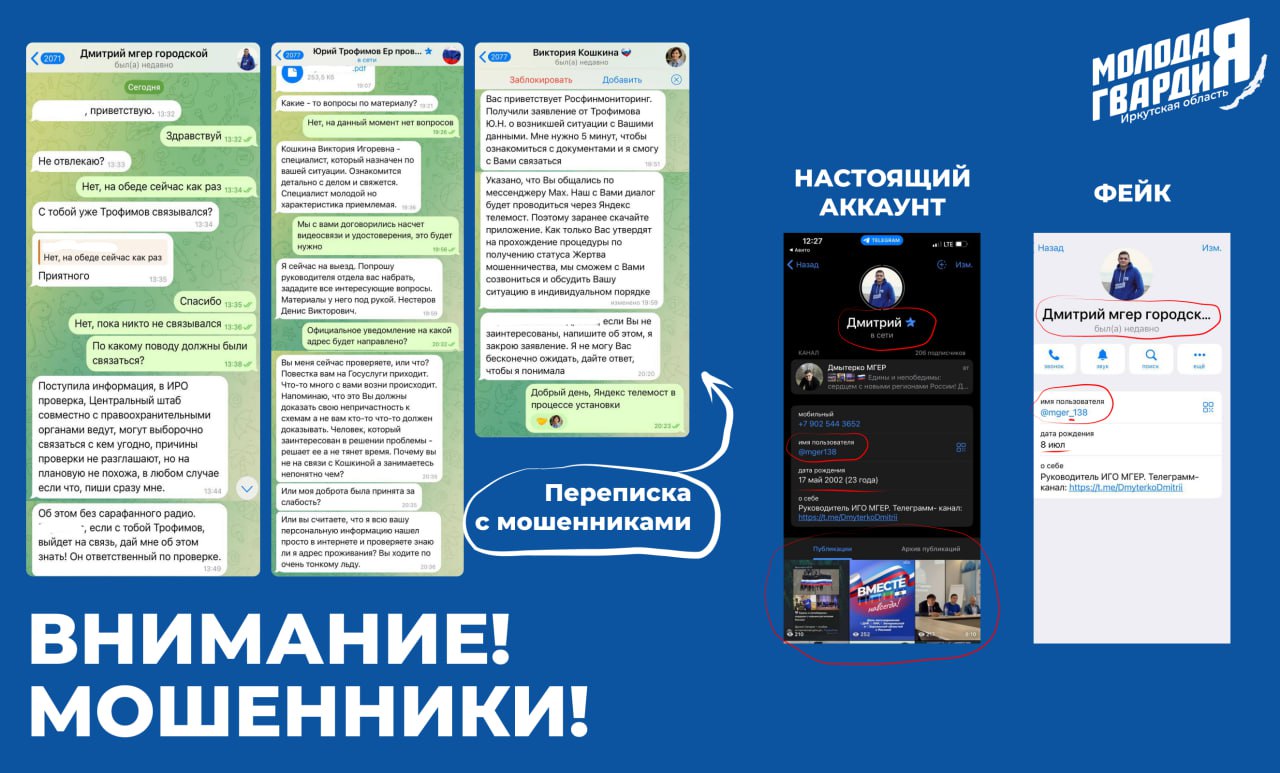 Уже зафиксировано несколько случаев. Мошенники создали фейковый аккаунт от лица руководителя Иркутского городского отделения Дмитрия Дмытерко, представителей Единой России и молодежного парламента при Законодательном Собрании Иркутской области.