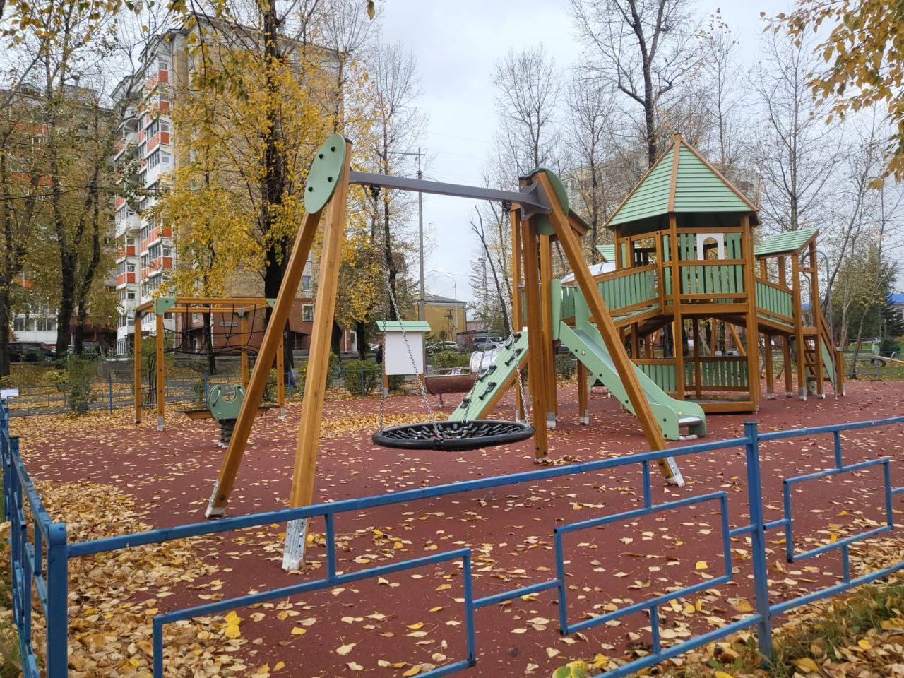 Для детей установили игровой комплекс, качели, песочницу и «качели-гнездо». Также на площадке появился спортивный комплекс. Покрытие выполнено из безопасного резинопола.