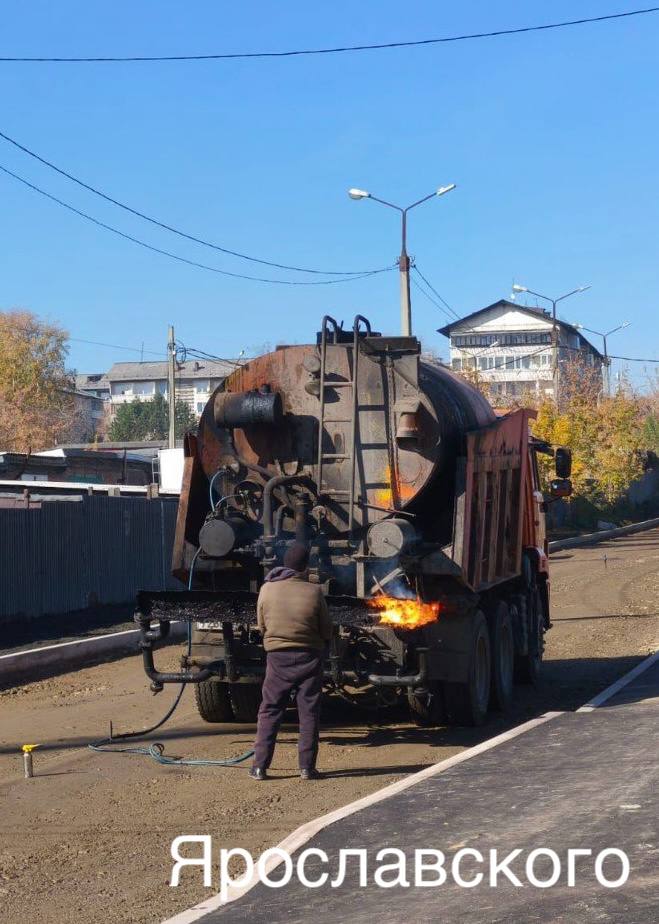Ярославского: укладывали асфальт на проезжей части, проводили отсыпку основания, выставляли бордюры, а также люки по высотным отметкам под верхний слой покрытия, обустраивали газоны.