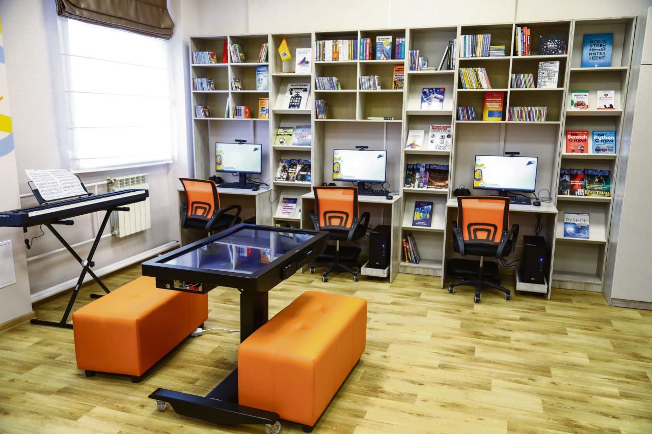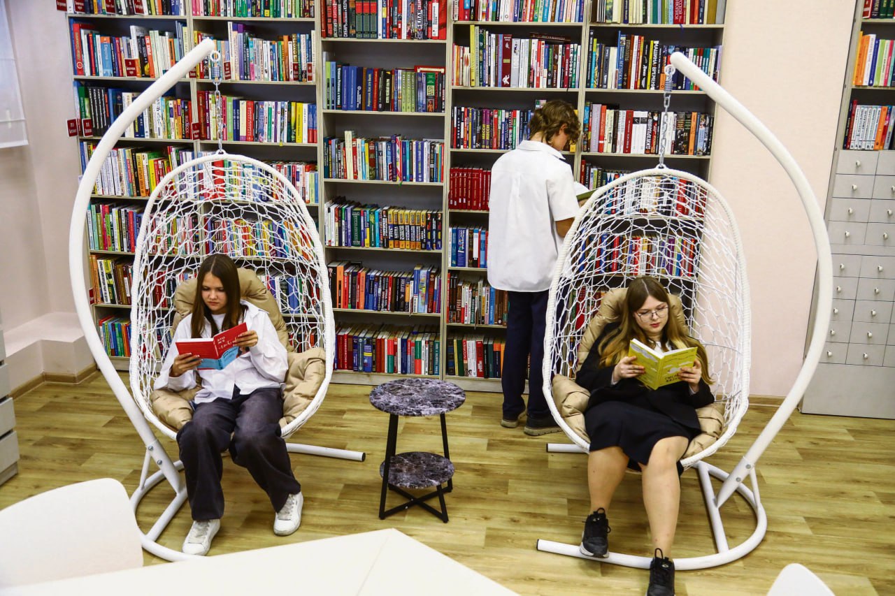—Это «Гостиная» — главное место в библиотеке, оно отведено для мероприятий, — рассказывает и показывает Татьяна Георгиевна.— «Мир детства» — крыло для малышей и школьников, «Читай-зона» — место, где посетитель взаимодействует с книгами и библиотекарем, «Зона отдыха и общения» — в этой части стеллажи с самыми разными книгами, с двумя подвесными креслами и мобильными столами-трансформерами, которые можно превратить в круг или расставить как индивидуальные парты.