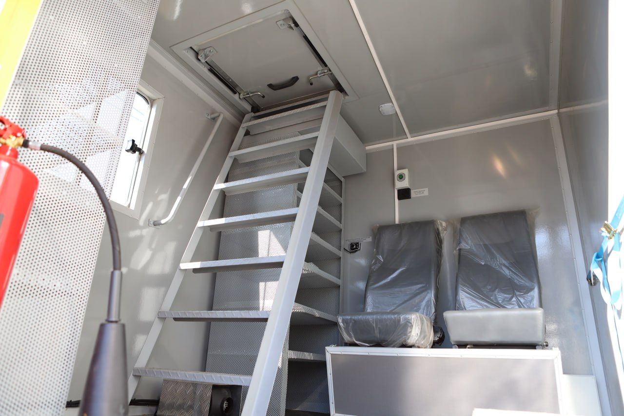 Автомобиль оборудован двумя площадками для осмотра линии контактной сети: стационарной и подъемной. Максимальная высота подъема второй – 7 метров. В кунге находятся сидения для бригады, лестницы для безопасного выхода наверх, обогреватель, рации для связи с водителем и машинистом автовышки.