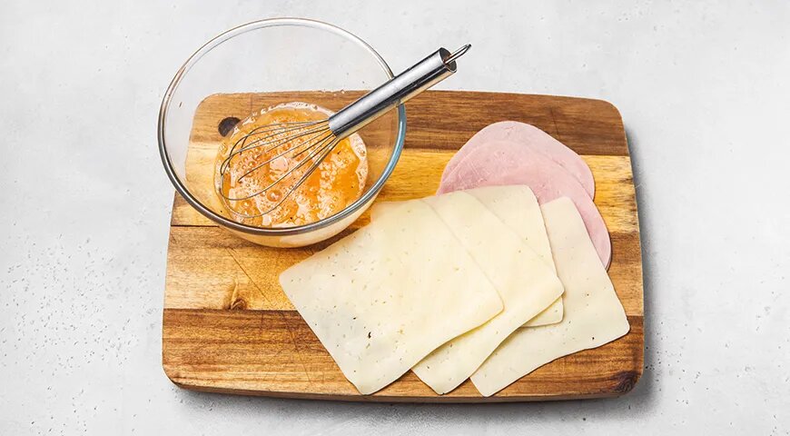 Первым делом нужно подготовить все ингредиенты. Ветчину и сыр нарезают ломтиками, которые по размеру соответствуют кусочкам хлеба. Яйца взбиваются с щепоткой соли и перца — это создаст объемную, насыщенную основу для нашего блюда.