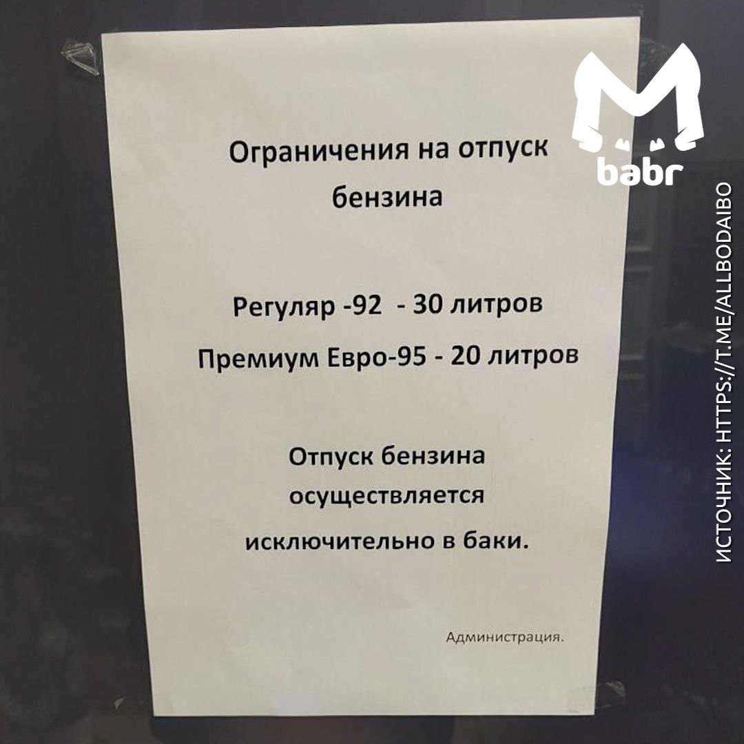 В Бодайбо работают две заправки, и на обеих ввели ограничения. На одной можно взять не больше 50 литров АИ-92 и АИ-95 — и только в бак автомобиля. На другой лимиты ещё жёстче: не больше 30 литров 92-го и 20 литров 95-го. В администрации ограничения подтвердили. Говорят, что делают все возможное, чтобы ускорить процесс поставки. Правда, по словам местных, не сильно успешно.