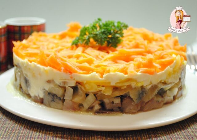 Как только все слои собраны, салат нужно оставить в холодильнике на несколько часов, чтобы он настоится и пропитается всеми вкусами.