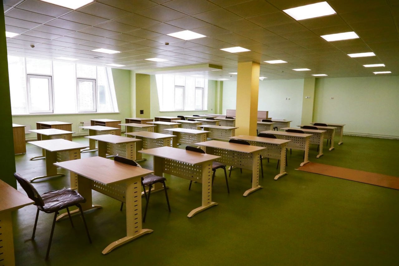 На огромных площадях, спроектированных по самым современным требованиям, заканчиваются отделочные работы. Устройство инженерных систем уже завершено, подключают отопление, специалисты монтируют подвесные потолки и светильники, укладывают линолеум, устанавливают плинтусы. Пищеблок сияет свежим кафелем, в коридорах уложена напольная плитка, в нескольких классах уже приступили к сборке мебели.