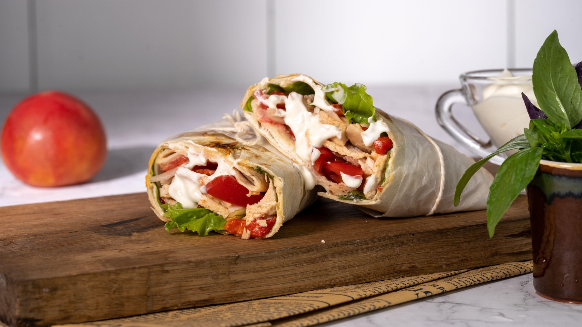 На одну порцию потребуются: один лаваш, 70 граммов куриного филе, 20 граммов твердого сыра, столько же болгарского перца, один огурец, немного лука, лист салата, греческий йогурт, чеснок, соевый соус и специи.