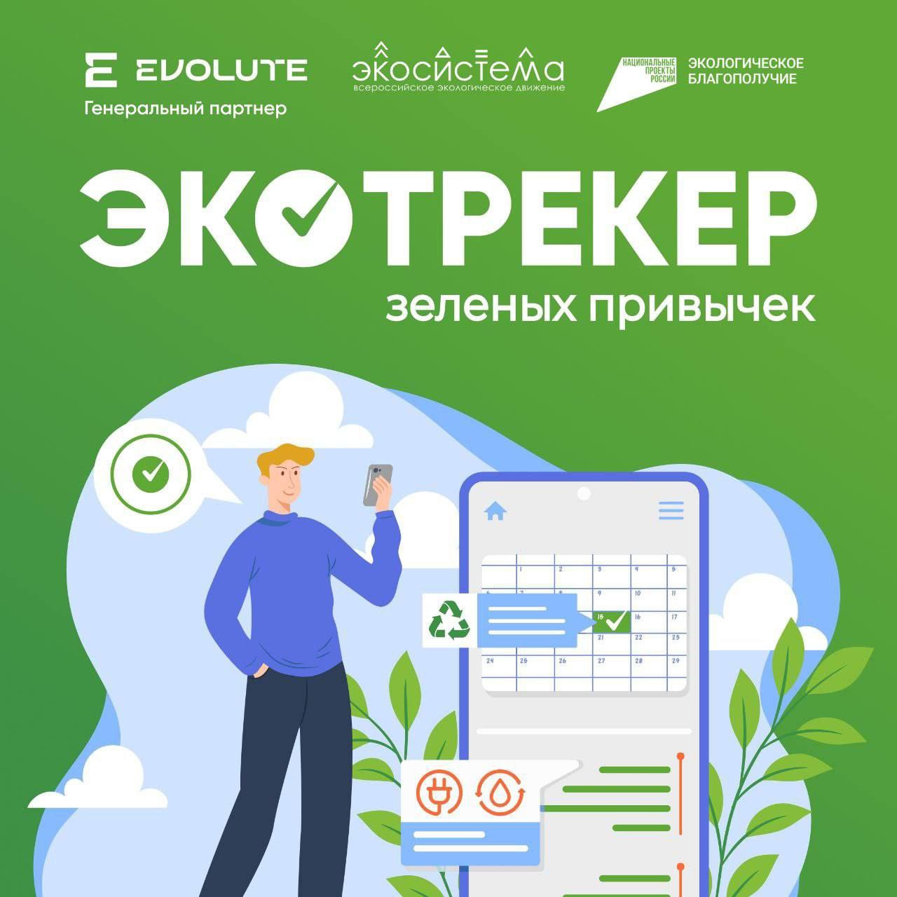 «Экотрекер зеленых привычек» – это цифровой сервис в формате чат-бота во «ВКонтакте», который объединяет крупные всероссийские экологические акции. Участники выполняют задания, фиксируют свои достижения с помощью фотографий и получают экобаллы. Проект реализуется при поддержке Министерства природных ресурсов и экологии РФ и бренда электромобилей Evolute.